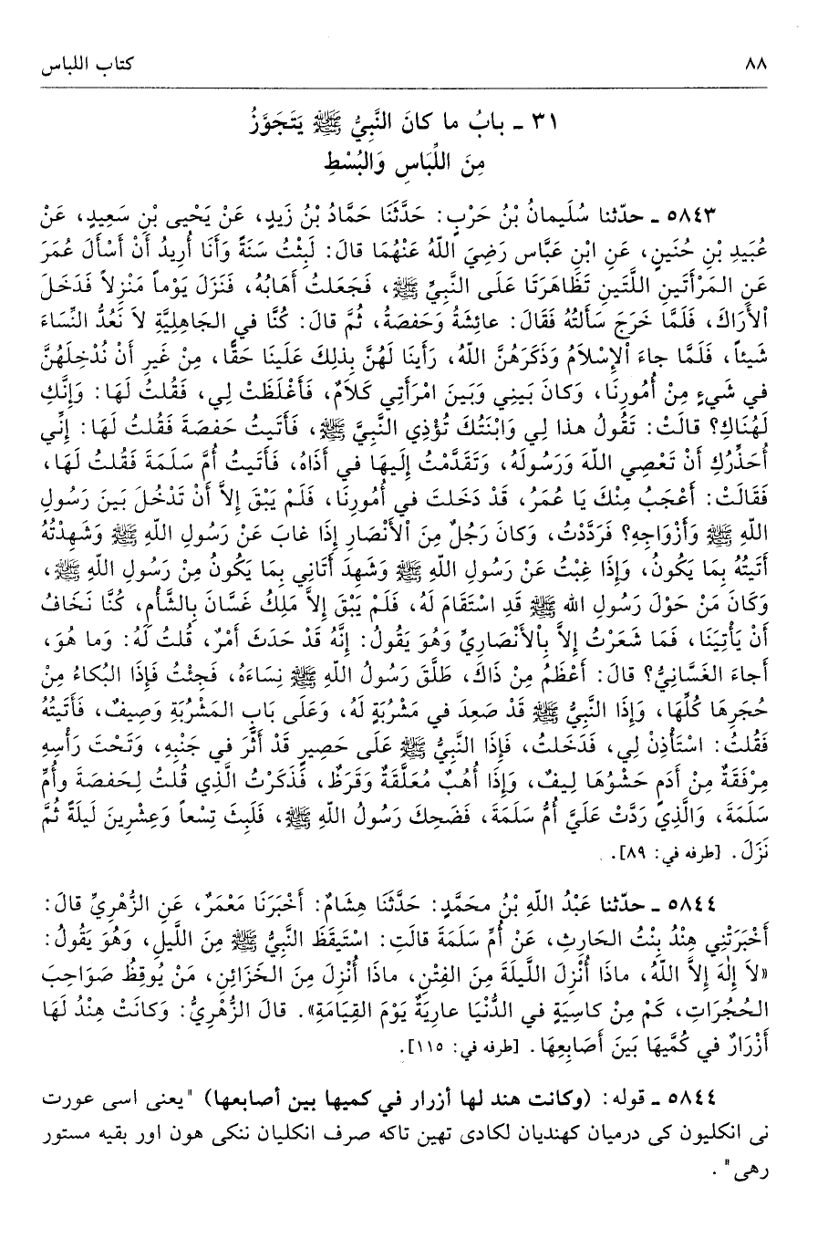 5844 - قوله: (وكانت هند لها أزرار في كميها بين أصابعها) "يعنى اسى عورت نى انكليون كى درميان كهنديان لكادى تهين تاكه صرف انكليان ننكى هون اور بقيه مستور رهى".