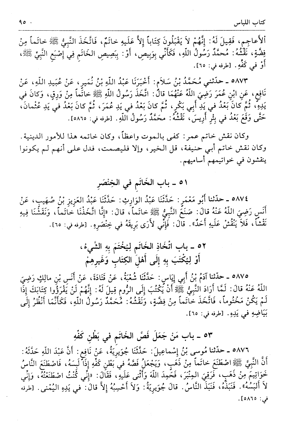 5875 - حَدَّثَنَا آدَمُ بْنُ أَبِى إِيَاسٍ حَدَّثَنَا شُعْبَةُ عَنْ قَتَادَةَ عَنْ أَنَسِ بْنِ مَالِكٍ - رضى الله عنه - قَالَ لَمَّا أَرَادَ النَّبِىُّ - صلى الله عليه وسلم - أَنْ يَكْتُبَ إِلَى الرُّومِ قِيلَ لَهُ إِنَّهُمْ لَنْ يَقْرَءُوا كِتَابَكَ إِذَا لَمْ يَكُنْ مَخْتُومًا. فَاتَّخَذَ خَاتَمًا مِنْ فِضَّةٍ، وَنَقْشُهُ مُحَمَّدٌ رَسُولُ اللَّهِ. فَكَأَنَّمَا أَنْظُرُ إِلَى بَيَاضِهِ فِى يَدِهِ. أطرافه 65، 2938، 5870، 5872، 5874، 5877، 7162 - تحفة 1256