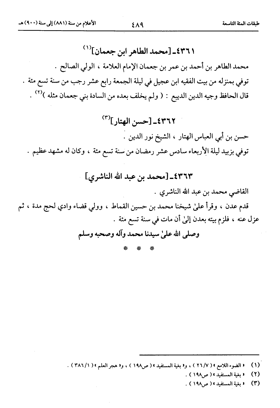 (1) «الضوء اللامع» (7/ 26)، و «بغية المستفيد» (ص 198)، و «هجر العلم» (1/ 386).