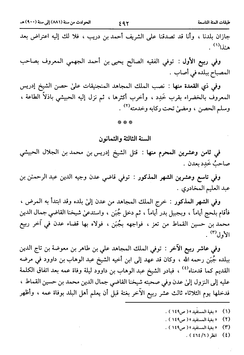 وفي عاشر ربيع الآخر: توفي الملك المجاهد علي بن طاهر بن معوضة بن تاج الدين ببلده جبن رحمه الله، وكان قد عهد إلى ابن أخيه الشيخ عبد الوهاب بن داود في مرضه القديم كما قدمناه (4)، فبادر الشيخ عبد الوهاب بن داود ليلة وفاة عمه بعد اتفاق الكلمة عليه إلى النزول إلى عدن وفي صحبته شيخنا القاضي جمال الدين محمد بن حسين القماط، فدخلها يوم الثلاثاء ثالث عشر ربيع الآخر بغتة قبل أن يعلم أهل البلد بوفاة عمه، وأظهر