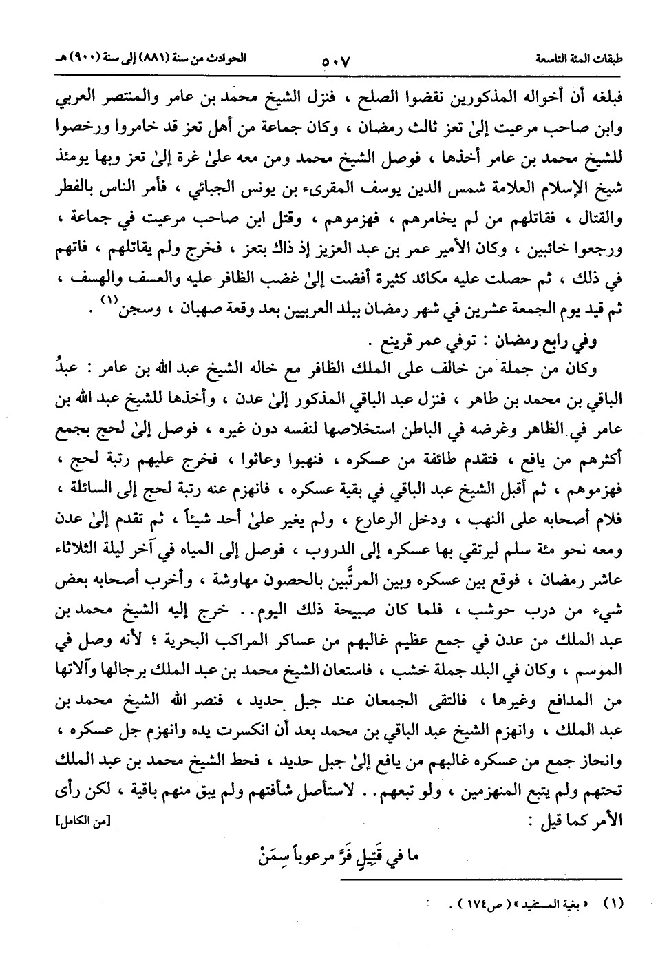 فبلغه أن أخواله المذكورين نقضوا الصلح، فنزل الشيخ محمد بن عامر والمنتصر العربي وابن صاحب مرعيت إلى تعز ثالث رمضان، وكان جماعة من أهل تعز قد خامروا ورخصوا للشيخ محمد بن عامر أخذها، فوصل الشيخ محمد ومن معه على غرة إلى تعز وبها يومئذ شيخ الإسلام العلامة شمس الدين يوسف المقرئ بن يونس الجبائي، فأمر الناس بالفطر والقتال، فقاتلهم من لم يخامرهم، فهزموهم، وقتل ابن صاحب مرعيت في جماعة، ورجعوا خائبين، وكان الأمير عمر بن عبد العزيز إذ ذاك بتعز، فخرج ولم يقاتلهم، فاتهم في ذلك، ثم حصلت عليه مكائد كثيرة أفضت إلى غضب الظافر عليه والعسف والهسف، ثم قيد يوم الجمعة عشرين في شهر رمضان ببلد العربيين بعد وقعة صهبان، وسجن (1).
