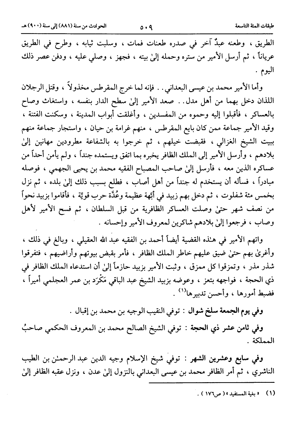 وفي سابع وعشرين الشهر: توفي شيخ الإسلام وجيه الدين عبد الرحمن بن الطيب الناشري، ثم أمر الظافر محمد بن عيسى البعداني بالنزول إلى عدن، ونزل عقبه الظافر إلى