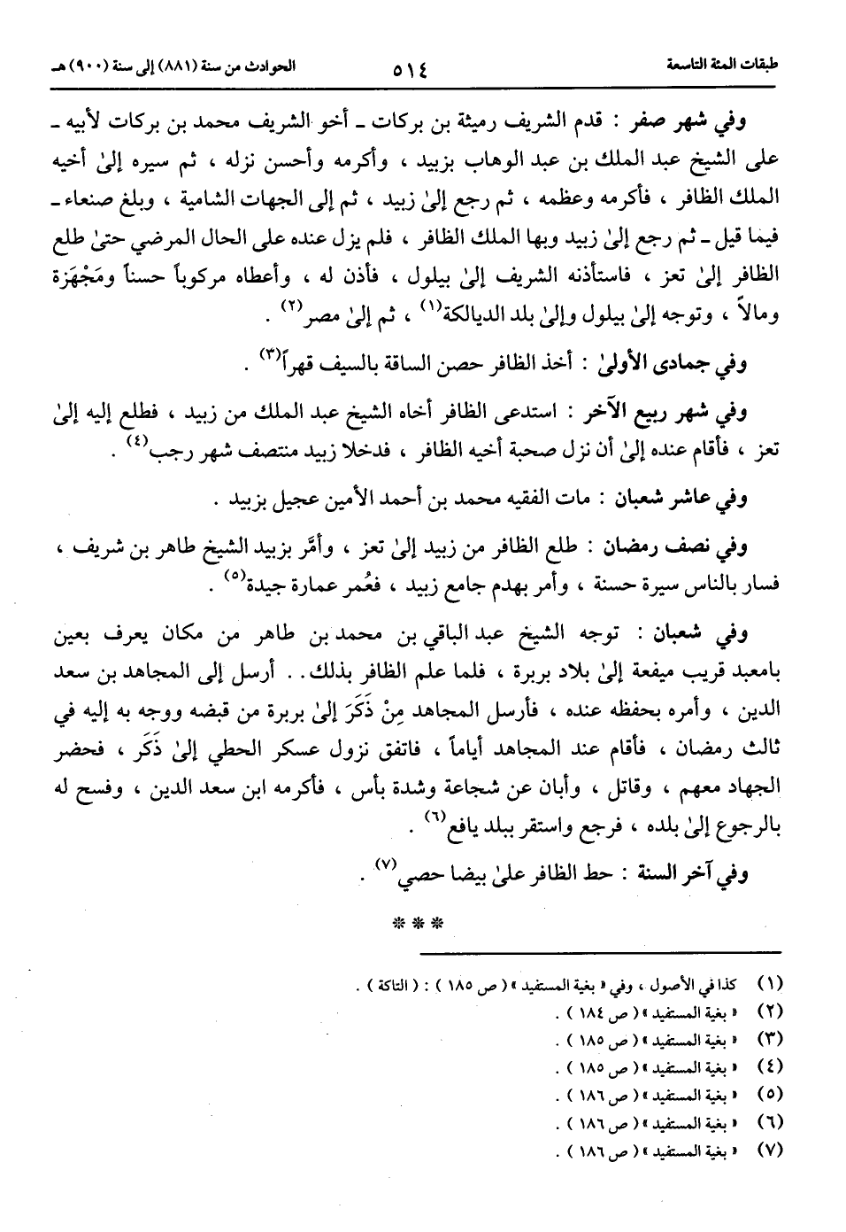 وفي شهر صفر: قدم الشريف رميثة بن بركات-أخو الشريف محمد بن بركات لأبيه- على الشيخ عبد الملك بن عبد الوهاب بزبيد، وأكرمه وأحسن نزله، ثم سيره إلى أخيه الملك الظافر، فأكرمه وعظمه، ثم رجع إلى زبيد، ثم إلى الجهات الشامية، وبلغ صنعاء- فيما قيل-ثم رجع إلى زبيد وبها الملك الظافر، فلم يزل عنده على الحال المرضي حتى طلع الظافر إلى تعز، فاستأذنه الشريف إلى بيلول، فأذن له، وأعطاه مركوبا حسنا ومجهزة ومالا، وتوجه إلى بيلول وإلى بلد الديالكة (1)، ثم إلى مصر (2).