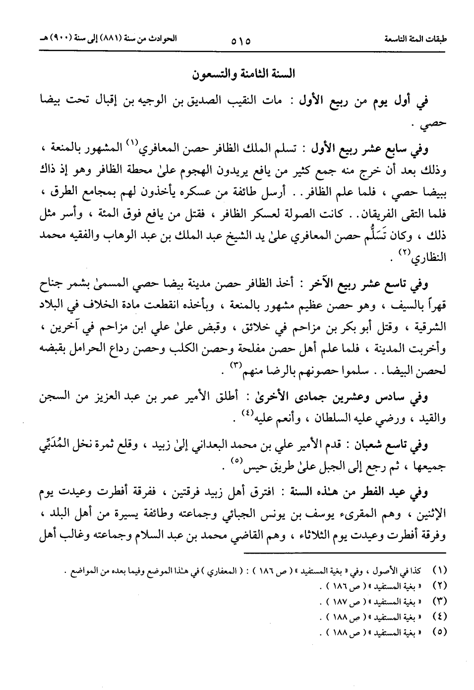 وفي سابع عشر ربيع الأول: تسلم الملك الظافر حصن المعافري (1) المشهور بالمنعة، وذلك بعد أن خرج منه جمع كثير من يافع يريدون الهجوم على محطة الظافر وهو إذ ذاك ببيضا حصي، فلما علم الظافر .. أرسل طائفة من عسكره يأخذون لهم بمجامع الطرق، فلما التقى الفريقان .. كانت الصولة لعسكر الظافر، فقتل من يافع فوق المائة، وأسر مثل ذلك، وكان تسلّم حصن المعافري على يد الشيخ عبد الملك بن عبد الوهاب والفقيه محمد النظاري (2).