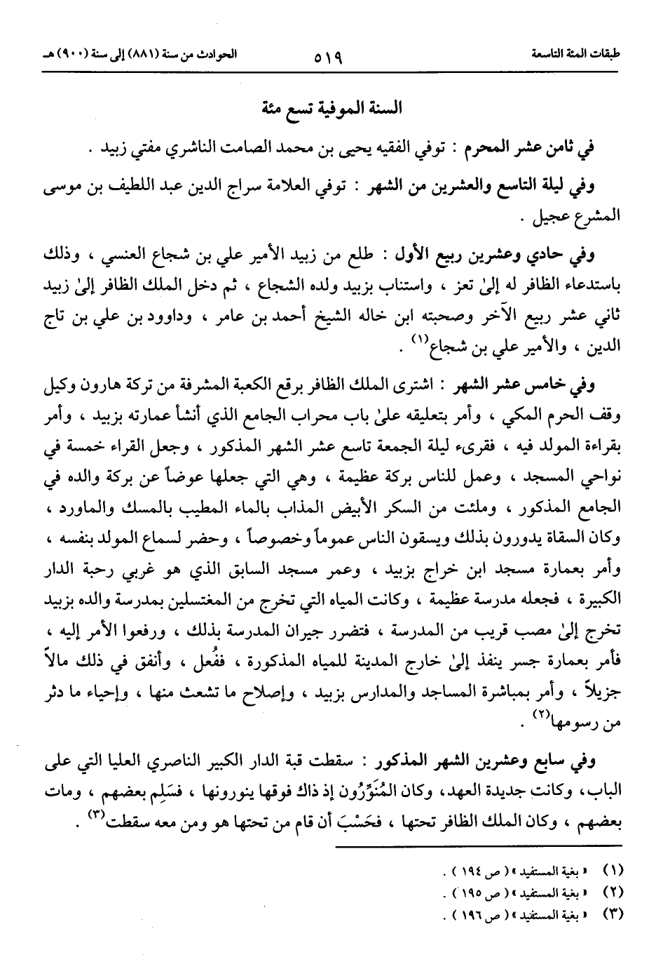وفي خامس عشر الشهر: اشترى الملك الظافر برقع الكعبة المشرفة من تركة هارون وكيل وقف الحرم المكي، وأمر بتعليقه على باب محراب الجامع الذي أنشأ عمارته بزبيد، وأمر بقراءة المولد فيه، فقرئ ليلة الجمعة تاسع عشر الشهر المذكور، وجعل القراء خمسة في نواحي المسجد، وعمل للناس بركة عظيمة، وهي التي جعلها عوضا عن بركة والده في الجامع المذكور، وملئت من السكر الأبيض المذاب بالماء المطيب بالمسك والماورد، وكان السقاة يدورون بذلك ويسقون الناس عموما وخصوصا، وحضر لسماع المولد بنفسه، وأمر بعمارة مسجد ابن خراج بزبيد، وعمر مسجد السابق الذي هو غربي رحبة الدار الكبيرة، فجعله مدرسة عظيمة، وكانت المياه التي تخرج من المغتسلين بمدرسة والده بزبيد تخرج إلى مصب قريب من المدرسة، فتضرر جيران المدرسة بذلك، ورفعوا الأمر إليه، فأمر بعمارة جسر ينفذ إلى خارج المدينة للمياه المذكورة، ففعل، وأنفق في ذلك مالا جزيلا، وأمر بمباشرة المساجد والمدارس بزبيد، وإصلاح ما تشعث منها، وإحياء ما دثر من رسومها (2).