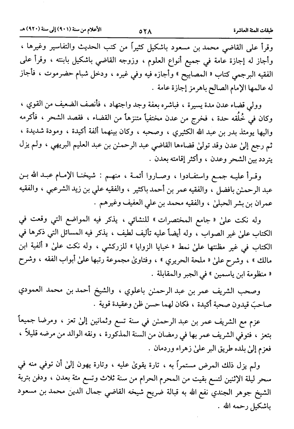 ولم يزل ذلك المرض مستمرا به، تارة يقوى عليه، وتارة يهون إلى أن توفي منه في سحر ليلة الاثنين لتسع بقيت من المحرم الحرام من سنة ثلاث وتسع مائة بعدن، ودفن بتربة الشيخ جوهر الجندي نفع الله به قبالة ضريح شيخه القاضي جمال الدين محمد بن مسعود باشكيل رحمه الله.