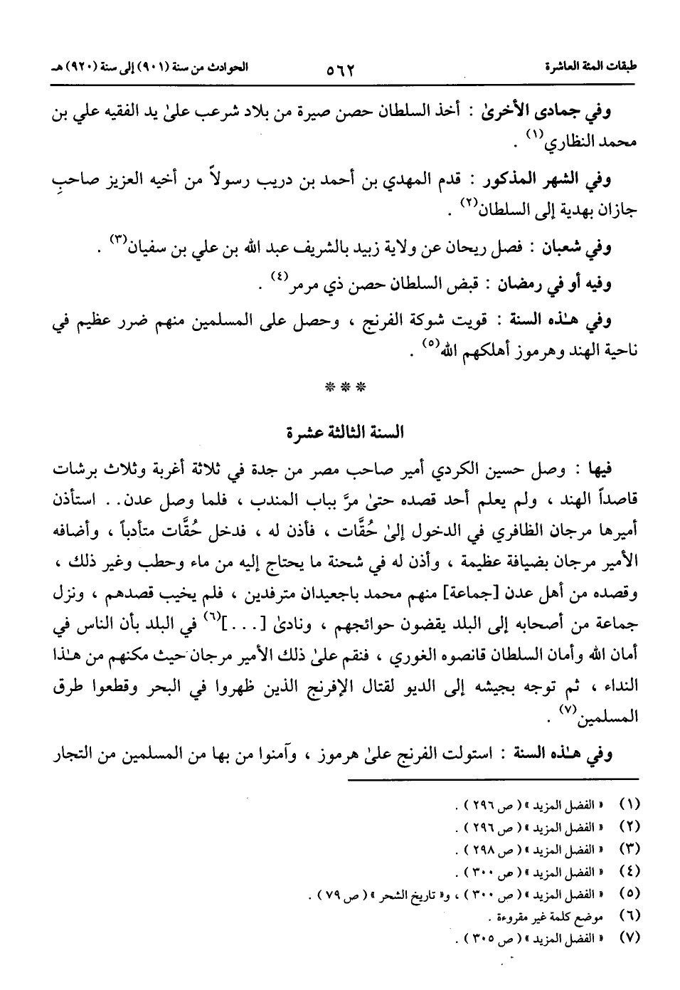 فيها: وصل حسين الكردي أمير صاحب مصر من جدة في ثلاثة أغربة وثلاث برشات قاصدا الهند، ولم يعلم أحد قصده حتى مرّ بباب المندب، فلما وصل عدن .. استأذن أميرها مرجان الظافري في الدخول إلى حقّات، فأذن له، فدخل حقّات متأدبا، وأضافه الأمير مرجان بضيافة عظيمة، وأذن له في شحنة ما يحتاج إليه من ماء وحطب وغير ذلك، وقصده من أهل عدن [جماعة] منهم محمد باجعيدان مترفدين، فلم يخيب قصدهم، ونزل جماعة من أصحابه إلى البلد يقضون حوائجهم، ونادى [ ... ] (6) في البلد بأن الناس في أمان الله وأمان السلطان قانصوه الغوري، فنقم على ذلك الأمير مرجان حيث مكنهم من هذا النداء، ثم توجه بجيشه إلى الديو لقتال الإفرنج الذين ظهروا في البحر وقطعوا طرق المسلمين (7).