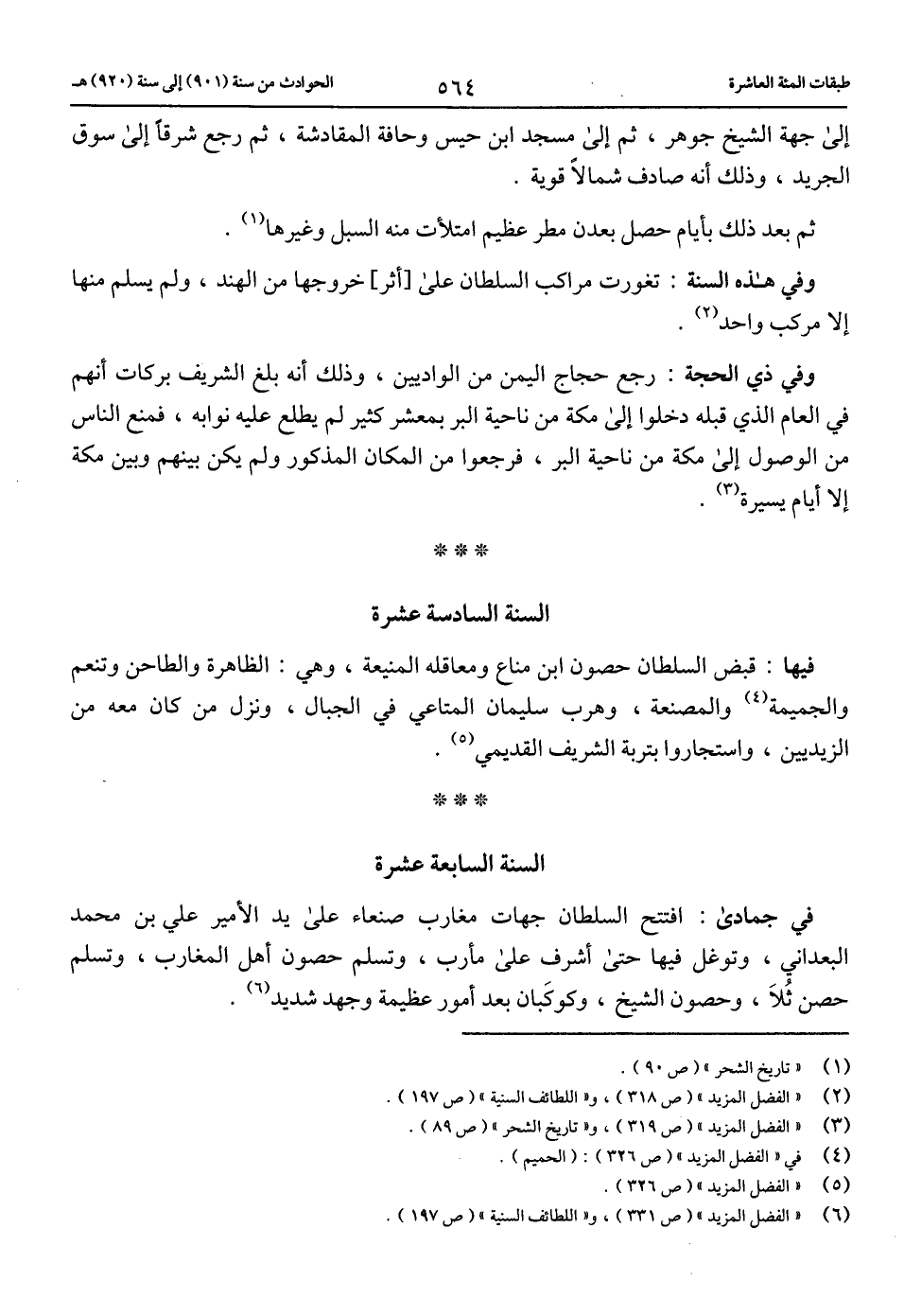 وفي ذي الحجة: رجع حجاج اليمن من الواديين، وذلك أنه بلغ الشريف بركات أنهم في العام الذي قبله دخلوا إلى مكة من ناحية البر بمعشر كثير لم يطلع عليه نوابه، فمنع الناس من الوصول إلى مكة من ناحية البر، فرجعوا من المكان المذكور ولم يكن بينهم وبين مكة إلا أيام يسيرة (3).