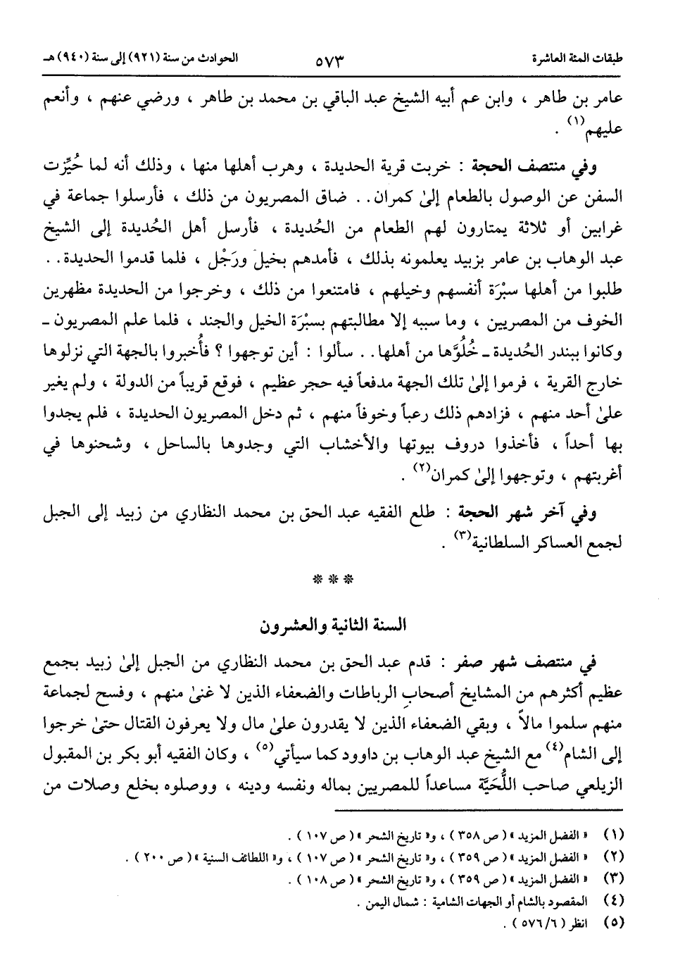 في منتصف شهر صفر: قدم عبد الحق بن محمد النظاري من الجبل إلى زبيد بجمع عظيم أكثرهم من المشايخ أصحاب الرباطات والضعفاء الذين لا غنى منهم، وفسح لجماعة منهم سلموا مالا، وبقي الضعفاء الذين لا يقدرون على مال ولا يعرفون القتال حتى خرجوا إلى الشام (4) مع الشيخ عبد الوهاب بن داود كما سيأتي (5)، وكان الفقيه أبو بكر بن المقبول الزيلعي صاحب اللّحيّة مساعدا للمصريين بماله ونفسه ودينه، ووصلوه بخلع وصلات من