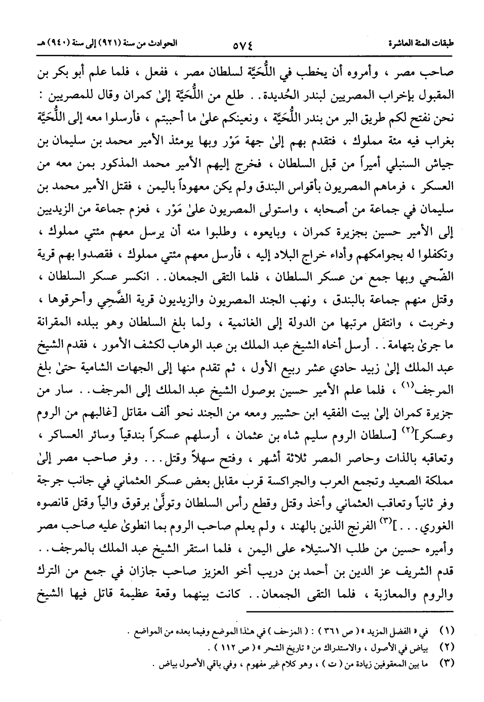 نحن نفتح لكم طريق البر من بندر اللّحيّة، ونعينكم على ما أحببتم، فأرسلوا معه إلى اللّحيّة بغراب فيه مائة مملوك، فتقدم بهم إلى جهة مور وبها يومئذ الأمير محمد بن سليمان بن جياش السنبلي أميرا من قبل السلطان، فخرج إليهم الأمير محمد المذكور بمن معه من العسكر، فرماهم المصريون بأقواس البندق ولم يكن معهودا باليمن، فقتل الأمير محمد بن سليمان في جماعة من أصحابه، واستولى المصريون على مور، فعزم جماعة من الزيديين إلى الأمير حسين بجزيرة كمران، وبايعوه، وطلبوا منه أن يرسل معهم مائتي مملوك، وتكفلوا له بجوامكهم وأداء خراج البلاد إليه، فأرسل معهم مائتي مملوك، فقصدوا بهم قرية الضّحي وبها جمع من عسكر السلطان، فلما التقى الجمعان .. انكسر عسكر السلطان، وقتل منهم جماعة بالبندق، ونهب الجند المصريون والزيديون قرية الضّحي وأحرقوها، وخربت، وانتقل مرتبها من الدولة إلى الغانمية، ولما بلغ السلطان وهو ببلده المقرانة ما جرى بتهامة .. أرسل أخاه الشيخ عبد الملك بن عبد الوهاب لكشف الأمور، فقدم الشيخ عبد الملك إلى زبيد حادي عشر ربيع الأول، ثم تقدم منها إلى الجهات الشامية حتى بلغ المرجف (1)، فلما علم الأمير حسين بوصول الشيخ عبد الملك إلى المرجف .. سار من جزيرة كمران إلى بيت الفقيه ابن حشيبر ومعه من الجند نحو ألف مقاتل [غالبهم من الروم وعسكر] (2) [سلطان الروم سليم شاه بن عثمان، أرسلهم عسكرا بندقيا وسائر العساكر، وتعاقبه بالذات وحاصر المصر ثلاثة أشهر، وفتح سهلا وقتل .. وفر صاحب مصر إلى مملكة الصعيد وتجمع العرب والجراكسة قرب مقابل بعض عسكر العثماني في جانب جرجة وفر ثانيا وتعاقب العثماني وأخذ وقتل وقطع رأس السلطان وتولّى برقوق واليا وقتل قانصوه الغوري ... ] (3) الفرنج الذين بالهند، ولم يعلم صاحب الروم بما انطوى عليه صاحب مصر وأميره حسين من طلب الاستيلاء على اليمن، فلما استقر الشيخ عبد الملك بالمرجف ..