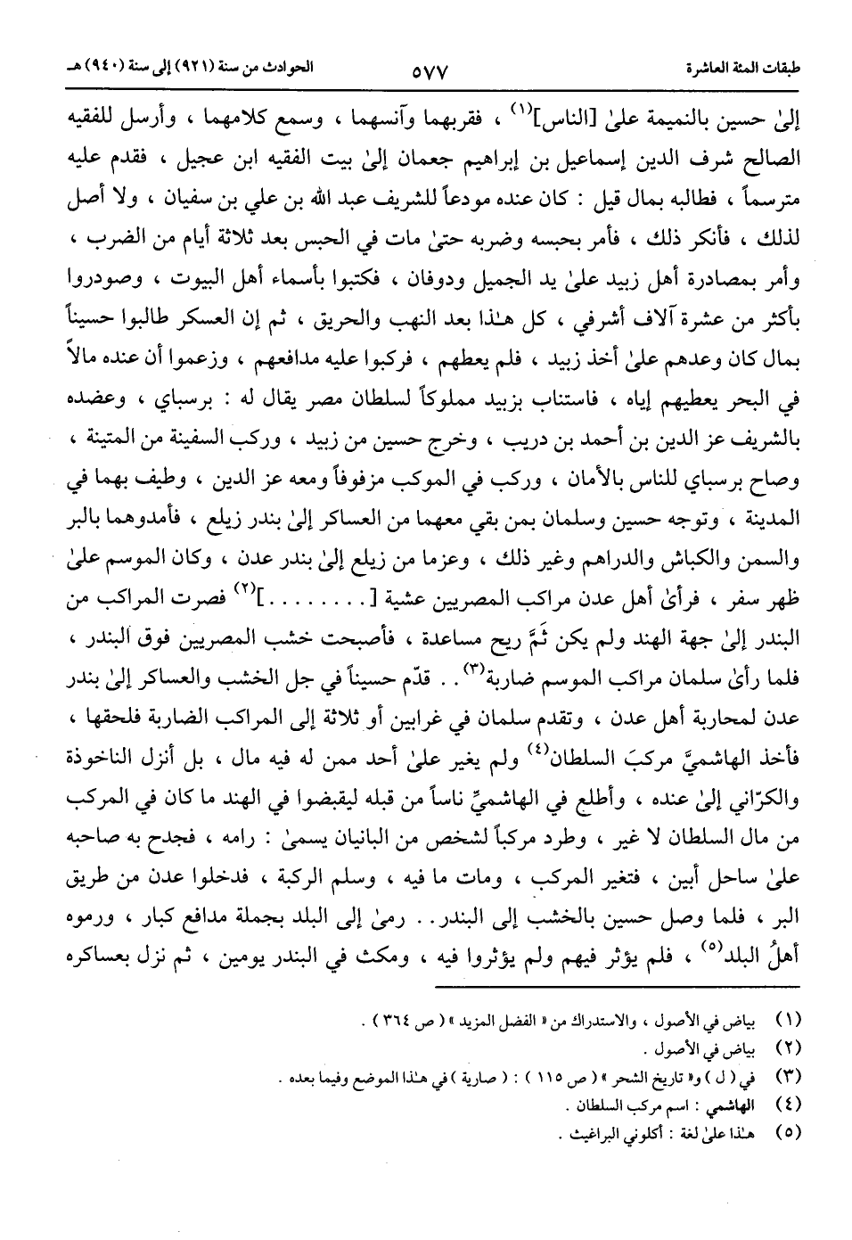 إلى حسين بالنميمة على [الناس] (1)، فقربهما وآنسهما، وسمع كلامهما، وأرسل للفقيه الصالح شرف الدين إسماعيل بن إبراهيم جعمان إلى بيت الفقيه ابن عجيل، فقدم عليه مترسما، فطالبه بمال قيل: كان عنده مودعا للشريف عبد الله بن علي بن سفيان، ولا أصل لذلك، فأنكر ذلك، فأمر بحبسه وضربه حتى مات في الحبس بعد ثلاثة أيام من الضرب، وأمر بمصادرة أهل زبيد على يد الجميل ودوفان، فكتبوا بأسماء أهل البيوت، وصودروا بأكثر من عشرة آلاف أشرفي، كل هذا بعد النهب والحريق، ثم إن العسكر طالبوا حسينا بمال كان وعدهم على أخذ زبيد، فلم يعطهم، فركبوا عليه مدافعهم، وزعموا أن عنده مالا في البحر يعطيهم إياه، فاستناب بزبيد مملوكا لسلطان مصر يقال له: برسباي، وعضده بالشريف عزّ الدين بن أحمد بن دريب، وخرج حسين من زبيد، وركب السفينة من المتينة، وصاح برسباي للناس بالأمان، وركب في الموكب مزفوفا ومعه عزّ الدين، وطيف بهما في المدينة، وتوجه حسين وسلمان بمن بقي معهما من العساكر إلى بندر زيلع، فأمدوهما بالبر والسمن والكباش والدراهم وغير ذلك، وعزما من زيلع إلى بندر عدن، وكان الموسم على ظهر سفر، فرأى أهل عدن مراكب المصريين عشية [ ........ ] (2) فصرت المراكب من البندر إلى جهة الهند ولم يكن ثمّ ريح مساعدة، فأصبحت خشب المصريين فوق البندر، فلما رأى سلمان مراكب الموسم ضاربة (3) .. قدّم حسينا في جل الخشب والعساكر إلى بندر عدن لمحاربة أهل عدن، وتقدم سلمان في غرابين أو ثلاثة إلى المراكب الضاربة فلحقها، فأخذ الهاشميّ مركب السلطان (4) ولم يغير على أحد ممن له فيه مال، بل أنزل الناخوذة والكرّاني إلى عنده، وأطلع في الهاشميّ ناسا من قبله ليقبضوا في الهند ما كان في المركب من مال السلطان لا غير، وطرد مركبا لشخص من البانيان يسمى: رامه، فجدح به صاحبه على ساحل أبين، فتغير المركب، ومات ما فيه، وسلم الركبة، فدخلوا عدن من طريق البر، فلما وصل حسين بالخشب إلى البندر .. رمى إلى البلد بجملة مدافع كبار، ورموه أهل البلد (5)، فلم يؤثر فيهم ولم يؤثروا فيه، ومكث في البندر يومين، ثم نزل بعساكره