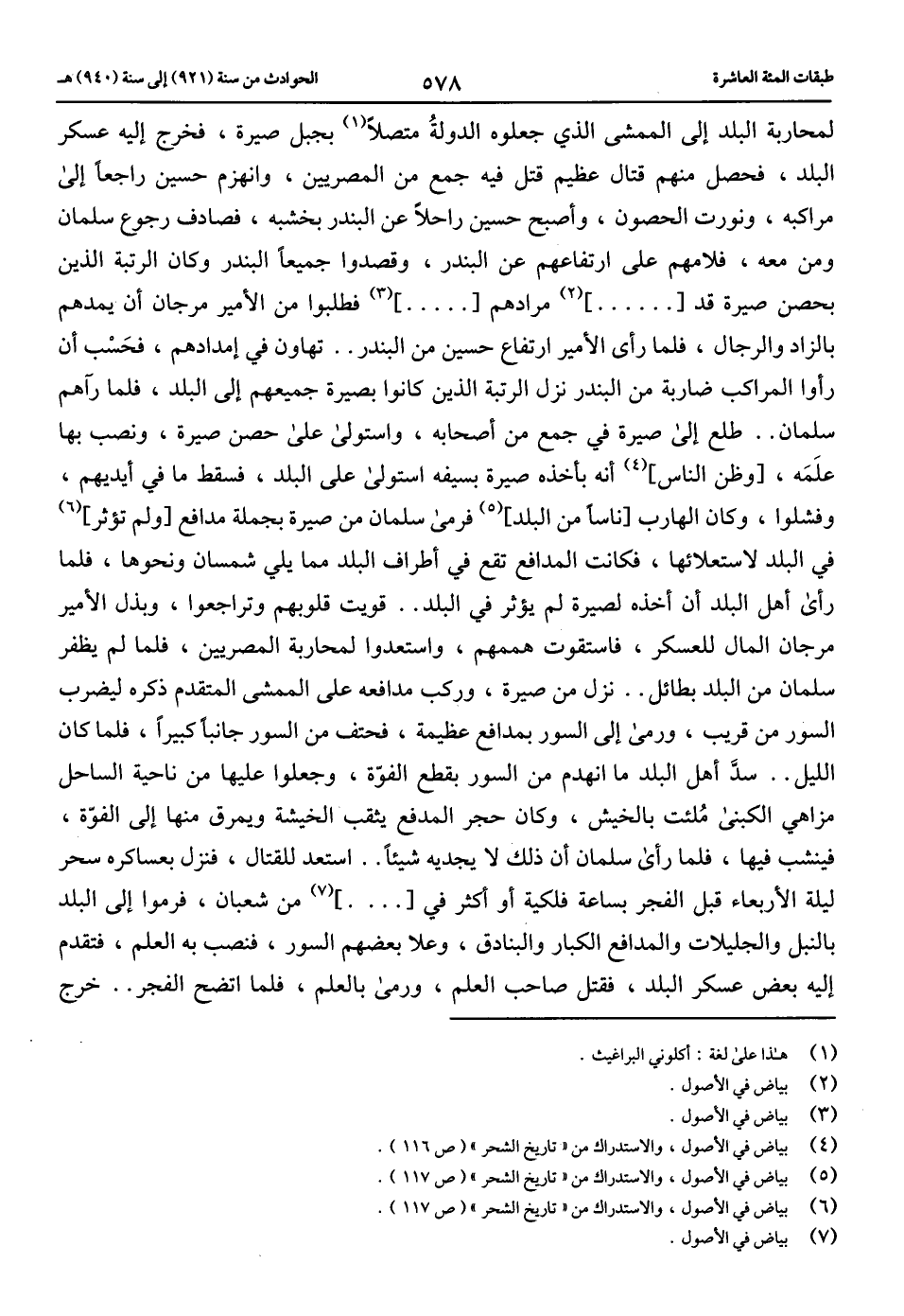 لمحاربة البلد إلى الممشى الذي جعلوه الدولة متصلا (1) بجبل صيرة، فخرج إليه عسكر البلد، فحصل منهم قتال عظيم قتل فيه جمع من المصريين، وانهزم حسين راجعا إلى مراكبه، ونورت الحصون، وأصبح حسين راحلا عن البندر بخشبه، فصادف رجوع سلمان ومن معه، فلامهم على ارتفاعهم عن البندر، وقصدوا جميعا البندر وكان الرتبة الذين بحصن صيرة قد [ ...... ] (2) مرادهم [ ..... ] (3) فطلبوا من الأمير مرجان أن يمدهم بالزاد والرجال، فلما رأى الأمير ارتفاع حسين من البندر .. تهاون في إمدادهم، فحسب أن رأوا المراكب ضاربة من البندر نزل الرتبة الذين كانوا بصيرة جميعهم إلى البلد، فلما رآهم سلمان .. طلع إلى صيرة في جمع من أصحابه، واستولى على حصن صيرة، ونصب بها علمه، [وظن الناس] (4) أنه بأخذه صيرة بسيفه استولى على البلد، فسقط ما في أيديهم، وفشلوا، وكان الهارب [ناسا من البلد] (5) فرمى سلمان من صيرة بجملة مدافع [ولم تؤثر] (6) في البلد لاستعلائها، فكانت المدافع تقع في أطراف البلد مما يلي شمسان ونحوها، فلما رأى أهل البلد أن أخذه لصيرة لم يؤثر في البلد .. قويت قلوبهم وتراجعوا، وبذل الأمير مرجان المال للعسكر، فاستقوت هممهم، واستعدوا لمحاربة المصريين، فلما لم يظفر سلمان من البلد بطائل .. نزل من صيرة، وركب مدافعه على الممشى المتقدم ذكره ليضرب السور من قريب، ورمى إلى السور بمدافع عظيمة، فحتف من السور جانبا كبيرا، فلما كان الليل .. سدّ أهل البلد ما انهدم من السور بقطع الفوّة، وجعلوا عليها من ناحية الساحل مزاهي الكبنى ملئت بالخيش، وكان حجر المدفع يثقب الخيشة ويمرق منها إلى الفوّة، فينشب فيها، فلما رأى سلمان أن ذلك لا يجديه شيئا .. استعد للقتال، فنزل بعساكره سحر ليلة الأربعاء قبل الفجر بساعة فلكية أو أكثر في [ .... ] (7) من شعبان، فرموا إلى البلد بالنبل والجليلات والمدافع الكبار والبنادق، وعلا بعضهم السور، فنصب به العلم، فتقدم إليه بعض عسكر البلد، فقتل صاحب العلم، ورمى بالعلم، فلما اتضح الفجر .. خرج