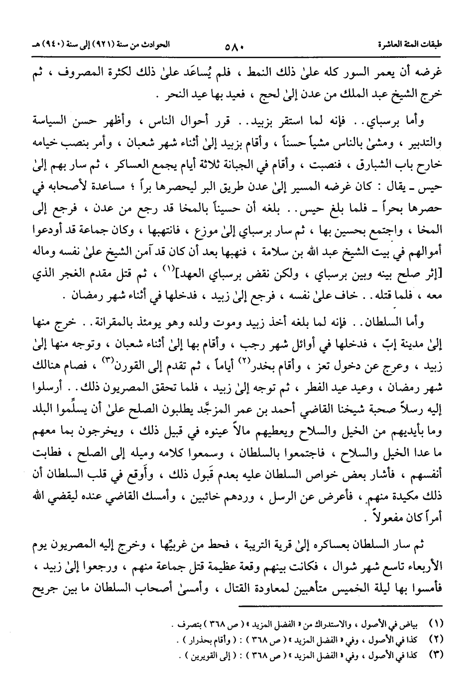 وأما السلطان .. فإنه لما بلغه أخذ زبيد وموت ولده وهو يومئذ بالمقرانة .. خرج منها إلى مدينة إبّ، فدخلها في أوائل شهر رجب، وأقام بها إلى أثناء شعبان، وتوجه منها إلى زبيد، وعرج عن دخول تعز، وأقام بخدر (2) أياما، ثم تقدم إلى القورن (3)، فصام هنالك شهر رمضان، وعيد عيد الفطر، ثم توجه إلى زبيد، فلما تحقق المصريون ذلك .. أرسلوا إليه رسلا صحبة شيخنا القاضي أحمد بن عمر المزجّد يطلبون الصلح على أن يسلّموا البلد وما بأيديهم من الخيل والسلاح ويعطيهم مالا عينوه في قبيل ذلك، ويخرجون بما معهم ما عدا الخيل والسلاح، فاجتمعوا بالسلطان، وسمعوا كلامه وميله إلى الصلح، فطابت أنفسهم، فأشار بعض خواص السلطان عليه بعدم قبول ذلك، وأوقع في قلب السلطان أن ذلك مكيدة منهم، فأعرض عن الرسل، وردهم خائبين، وأمسك القاضي عنده ليقضي الله أمرا كان مفعولا.