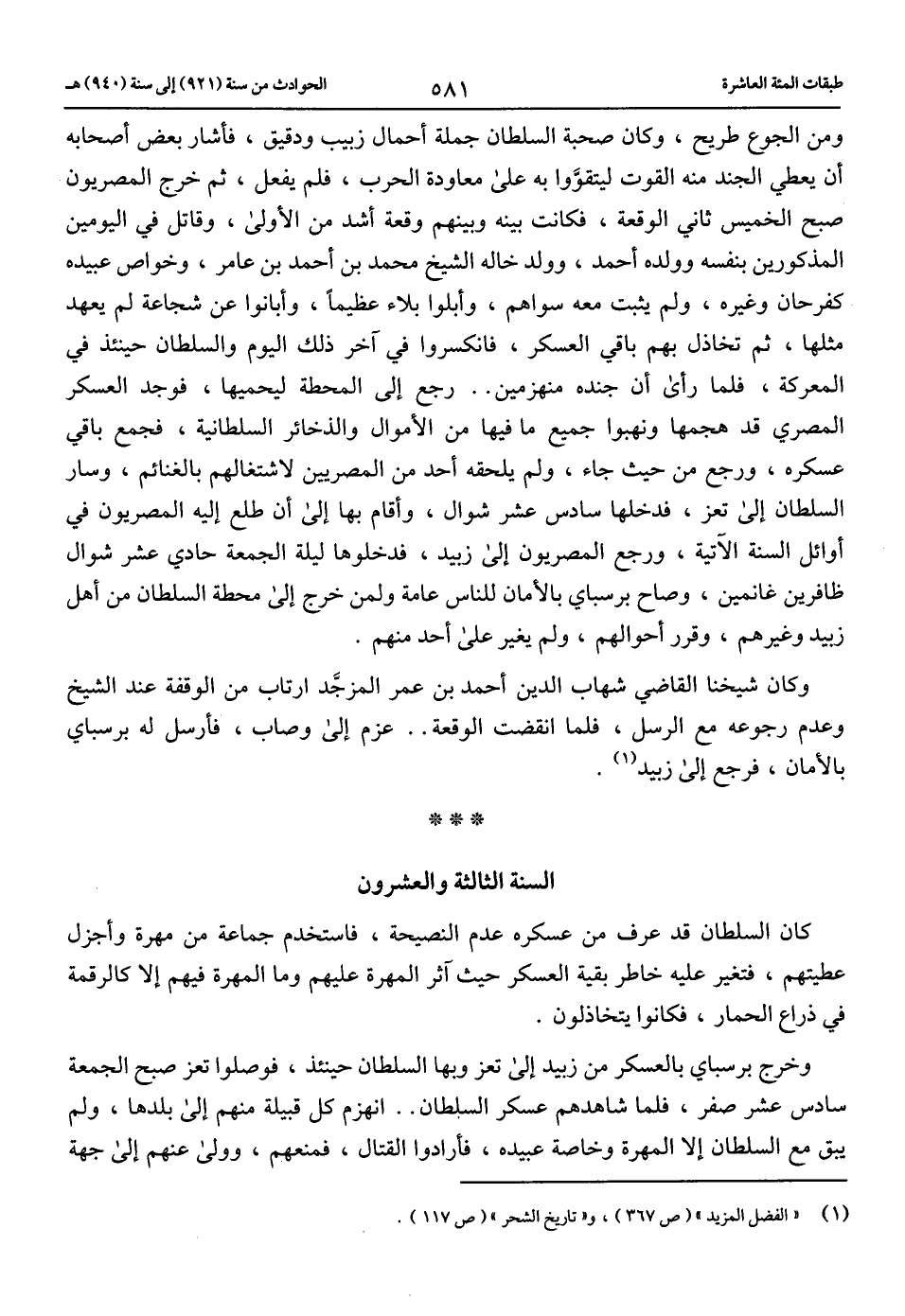 ومن الجوع طريح، وكان صحبة السلطان جملة أحمال زبيب ودقيق، فأشار بعض أصحابه أن يعطي الجند منه القوت ليتقوّوا به على معاودة الحرب، فلم يفعل، ثم خرج المصريون صبح الخميس ثاني الوقعة، فكانت بينه وبينهم وقعة أشد من الأولى، وقاتل في اليومين المذكورين بنفسه وولده أحمد، وولد خاله الشيخ محمد بن أحمد بن عامر، وخواص عبيده كفرحان وغيره، ولم يثبت معه سواهم، وأبلوا بلاء عظيما، وأبانوا عن شجاعة لم يعهد مثلها، ثم تخاذل بهم باقي العسكر، فانكسروا في آخر ذلك اليوم والسلطان حينئذ في المعركة، فلما رأى أن جنده منهزمين .. رجع إلى المحطة ليحميها، فوجد العسكر المصري قد هجمها ونهبوا جميع ما فيها من الأموال والذخائر السلطانية، فجمع باقي عسكره، ورجع من حيث جاء، ولم يلحقه أحد من المصريين لاشتغالهم بالغنائم، وسار السلطان إلى تعز، فدخلها سادس عشر شوال، وأقام بها إلى أن طلع إليه المصريون في أوائل السنة الآتية، ورجع المصريون إلى زبيد، فدخلوها ليلة الجمعة حادي عشر شوال ظافرين غانمين، وصاح برسباي بالأمان للناس عامة ولمن خرج إلى محطة السلطان من أهل زبيد وغيرهم، وقرر أحوالهم، ولم يغير على أحد منهم.
