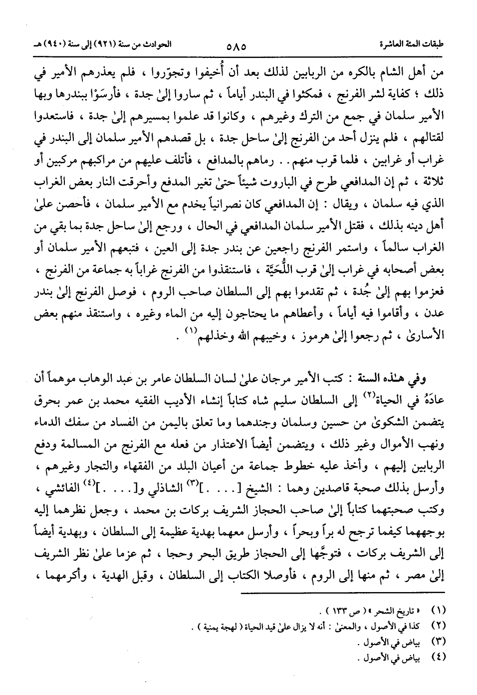 وفي هذه السنة: كتب الأمير مرجان على لسان السلطان عامر بن عبد الوهاب موهما أن عاده في الحياة (2) إلى السلطان سليم شاه كتابا إنشاء الأديب الفقيه محمد بن عمر بحرق يتضمن الشكوى من حسين وسلمان وجندهما وما تعلق باليمن من الفساد من سفك الدماء ونهب الأموال وغير ذلك، ويتضمن أيضا الاعتذار من فعله مع الفرنج من المسالمة ودفع الربابين إليهم، وأخذ عليه خطوط جماعة من أعيان البلد من الفقهاء والتجار وغيرهم، وأرسل بذلك صحبة قاصدين وهما: الشيخ [ .... ] (3) الشاذلي و [ .... ] (4) الفائشي، وكتب صحبتهما كتابا إلى صاحب الحجاز الشريف بركات بن محمد، وجعل نظرهما إليه بوجههما كيفما ترجح له برا وبحرا، وأرسل معهما بهدية عظيمة إلى السلطان، وبهدية أيضا إلى الشريف بركات، فتوجّها إلى الحجاز طريق البحر وحجا، ثم عزما على نظر الشريف إلى مصر، ثم منها إلى الروم، فأوصلا الكتاب إلى السلطان، وقبل الهدية، وأكرمهما،