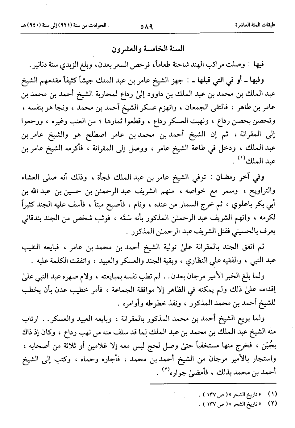 وفي آخر رمضان: توفي الشيخ عامر بن عبد الملك فجأة، وذلك أنه صلّى العشاء والتراويح، وسمر مع خواصه، منهم الشريف عبد الرحمن بن حسين بن عبد الله بن أبي بكر باعلوي، ثم خرج السمار من عنده، ونام، فأصبح ميتا، فأسف عليه الجند كثيرا لكرمه، واتهم الشريف عبد الرحمن المذكور بأنه سمّه، فوثب شخص من الجند بندقاني يعرف بالحسيني فقتل الشريف عبد الرحمن المذكور.