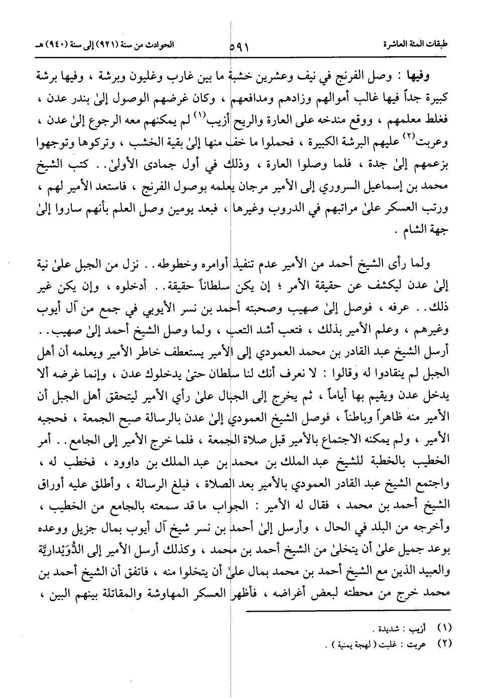 وفيها: وصل الفرنج في نيف وعشرين خشبة ما بين غارب وغليون وبرشة، وفيها برشة كبيرة جدا فيها غالب أموالهم وزادهم ومدافعهم، وكان غرضهم الوصول إلى بندر عدن، فغلط معلمهم، ووقع مندخه على العارة والريح أزيب (1) لم يمكنهم معه الرجوع إلى عدن، وعربت (2) عليهم البرشة الكبيرة، فحملوا ما خف منها إلى بقية الخشب، وتركوها وتوجهوا بزعمهم إلى جدة، فلما وصلوا العارة، وذلك في أول جمادى الأولى .. كتب الشيخ محمد بن إسماعيل السروري إلى الأمير مرجان يعلمه بوصول الفرنج، فاستعد الأمير لهم، ورتب العسكر على مراتبهم في الدروب وغيرها، فبعد يومين وصل العلم بأنهم ساروا إلى جهة الشام.