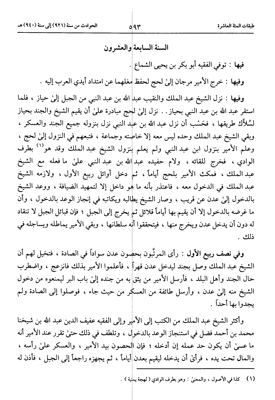 وفيها: نزل الشيخ عبد الملك والنقيب عبد الله بن عبد النبي من الجبل إلى حياز، فلما استقر عبد الله بن عبد النبي بحياز .. نزل إلى لحج مبادرة على أن يقيم الشيخ والجند بحياز لسلاّك طريقها، فحسب أن نزل عبد الله بن عبد النبي نزل بنزوله جميع الجند والعسكر، وبقي الشيخ عبد الملك وحده ليس معه إلا خاصته وجماعة، فتبعهم في النزول إلى لحج، وعلم الأمير بنزول ابن عبد النبي ولم يعلم بنزول الشيخ عبد الملك وقد هو (1) بطرف الوادي، فخرج للقائه، ولام حفيده عبد الله بن عبد النبي على ما فعله مع الشيخ عبد الملك، فمكث الأمير بلحج أياما، ثم دخل أوائل ربيع الأول، ولازمه الشيخ عبد الملك في الدخول معه، فاعتذر بأنه ما هو داخل إلا لتمهيد الضيافة، ووعد الشيخ بالدخول إلى عدن عن قريب، وصار الشيخ يطالبه ويكاتبه في إنجاز الوعد بالدخول، وأن ما غرضه بالدخول إلا أن يقيم بها أياما قلائل ثم يخرج إلى الجبل؛ فإن قبائل الجبل لا تنقاد له دون أن يدخل عدن ويخرج منها، فيتحققوا أنه سلطانها، وبقي الأمير يماطله ويساجله في ذلك.