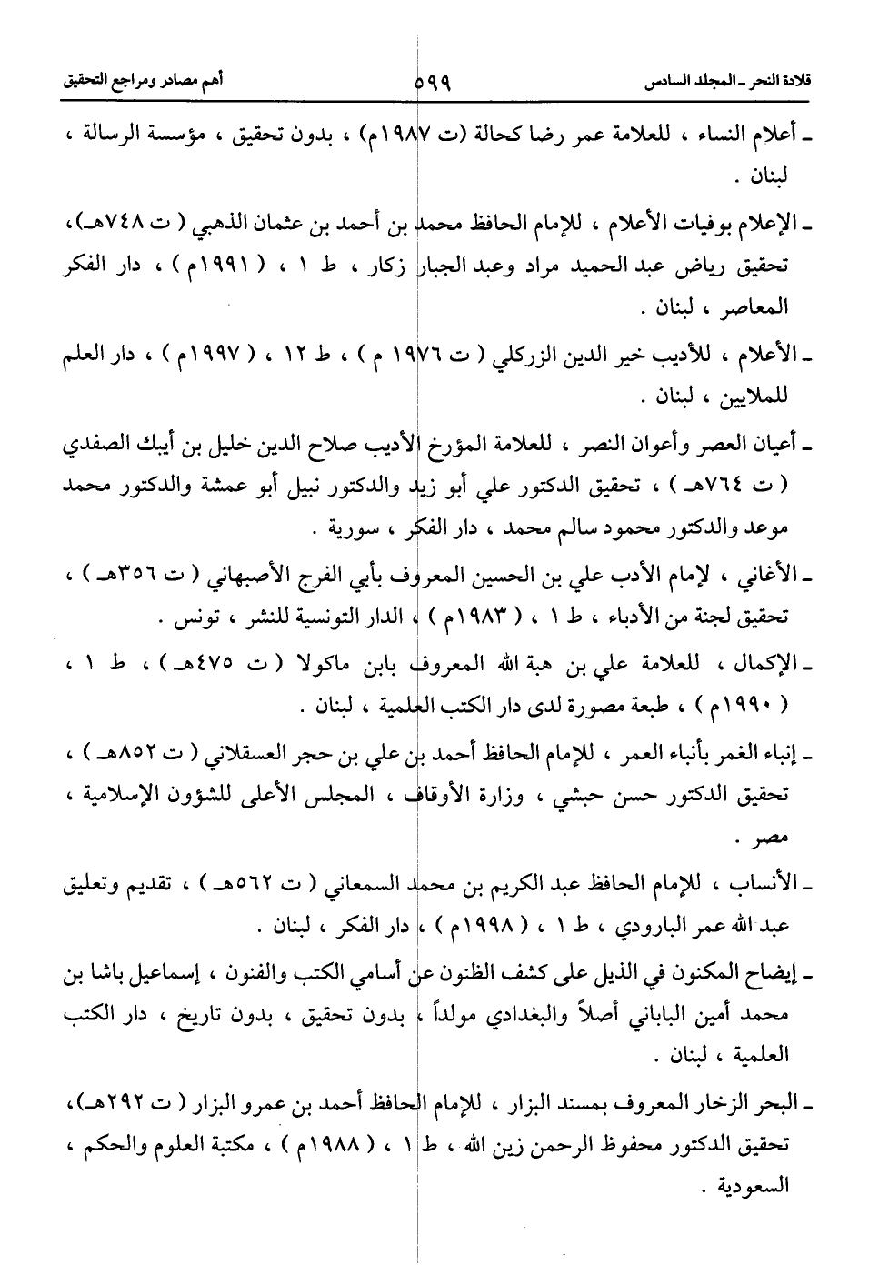 -الأنساب، للإمام الحافظ عبد الكريم بن محمد السمعاني (ت 562 هـ)، تقديم وتعليق عبد الله عمر البارودي، ط 1، (1998 م)، دار الفكر، لبنان.