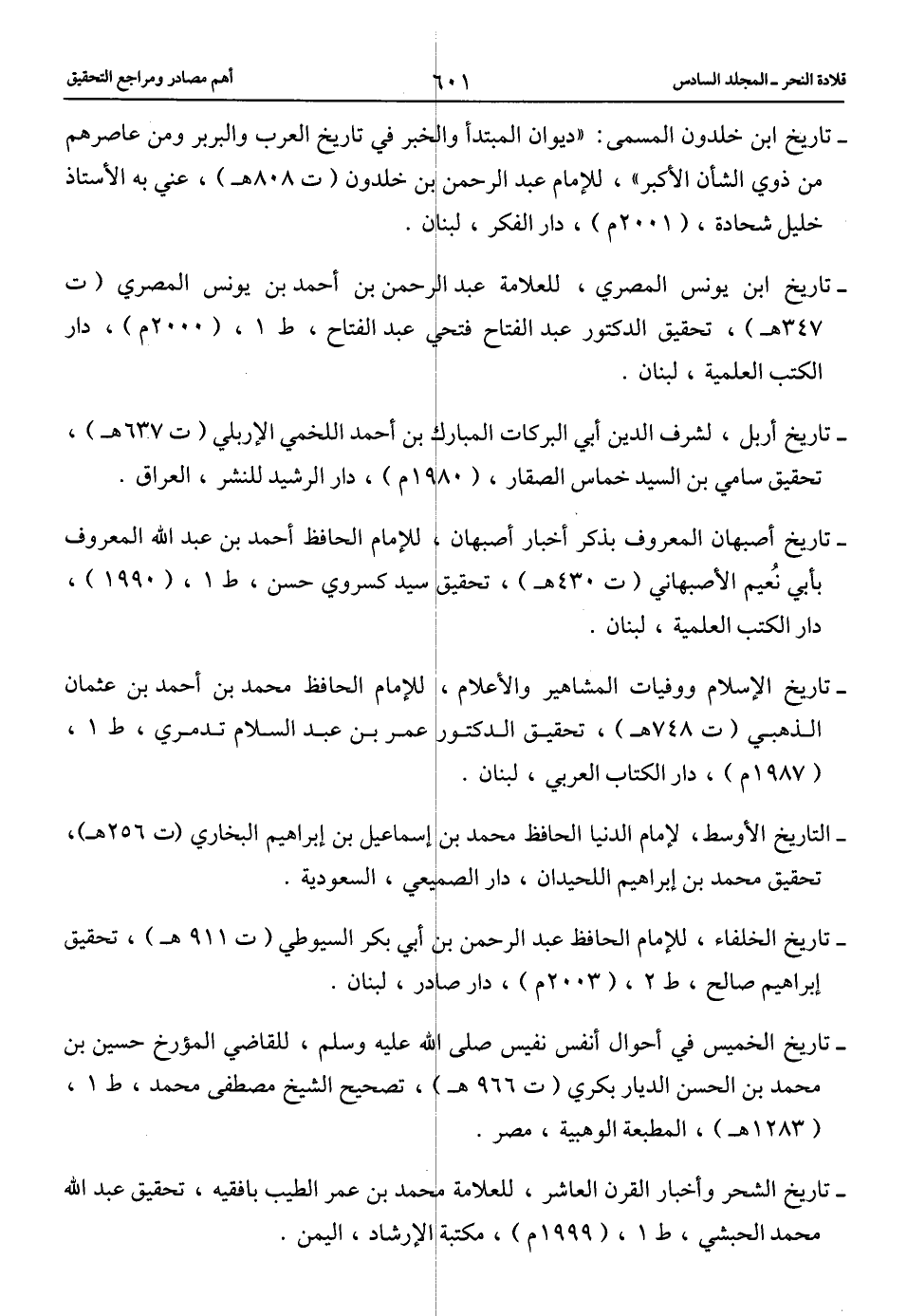 -تاريخ ابن خلدون المسمى: «ديوان المبتدأ والخبر في تاريخ العرب والبربر ومن عاصرهم من ذوي الشأن الأكبر»، للإمام عبد الرحمن بن خلدون (ت 808 هـ)، عني به الأستاذ خليل شحادة، (2001 م)، دار الفكر، لبنان.