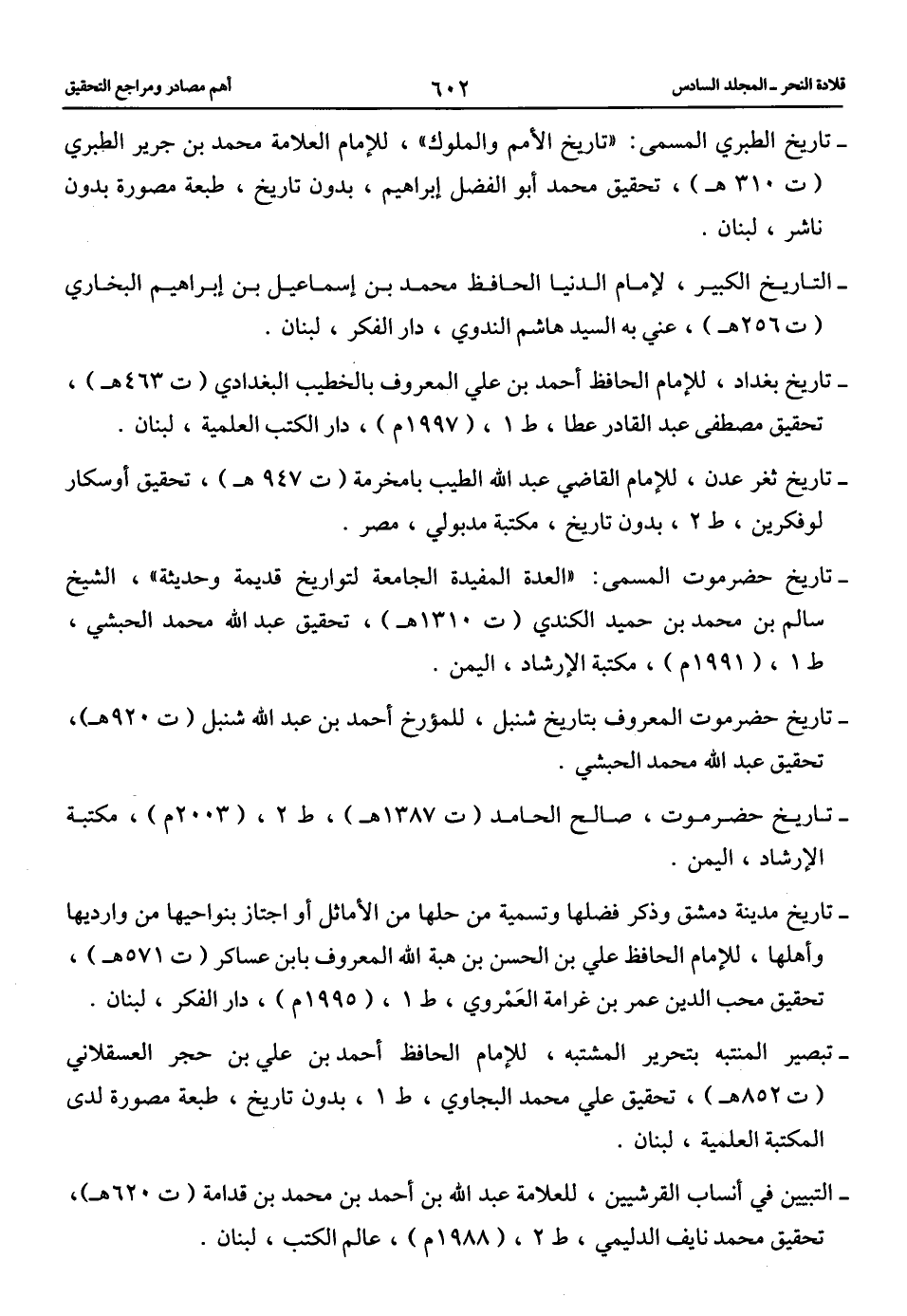 -تاريخ ثغر عدن، للإمام القاضي عبد الله الطيب بامخرمة (ت 947 هـ)، تحقيق أوسكار لوفكرين، ط 2، بدون تاريخ، مكتبة مدبولي، مصر.