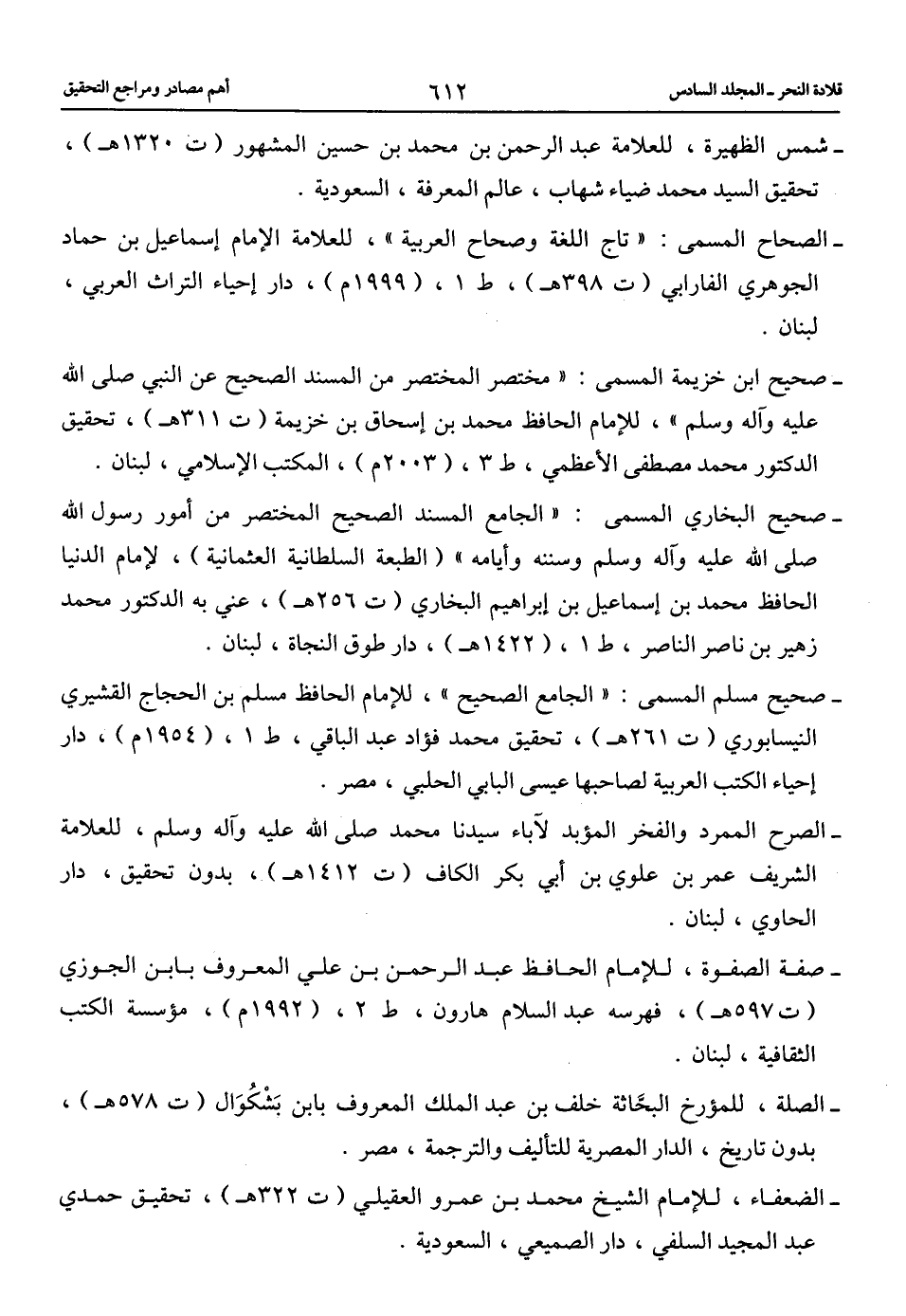 -صحيح مسلم المسمى: «الجامع الصحيح»، للإمام الحافظ مسلم بن الحجاج القشيري النيسابوري (ت 261 هـ)، تحقيق محمد فؤاد عبد الباقي، ط 1، (1954 م)، دار إحياء الكتب العربية لصاحبها عيسى البابي الحلبي، مصر.