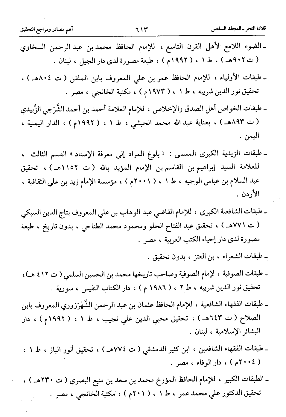 -طبقات الشافعية الكبرى، للإمام القاضي عبد الوهاب بن علي المعروف بتاج الدين السبكي (ت 771 هـ)، تحقيق عبد الفتاح الحلو ومحمود محمد الطناحي، بدون تاريخ، طبعة مصورة لدى دار إحياء الكتب العربية، مصر.