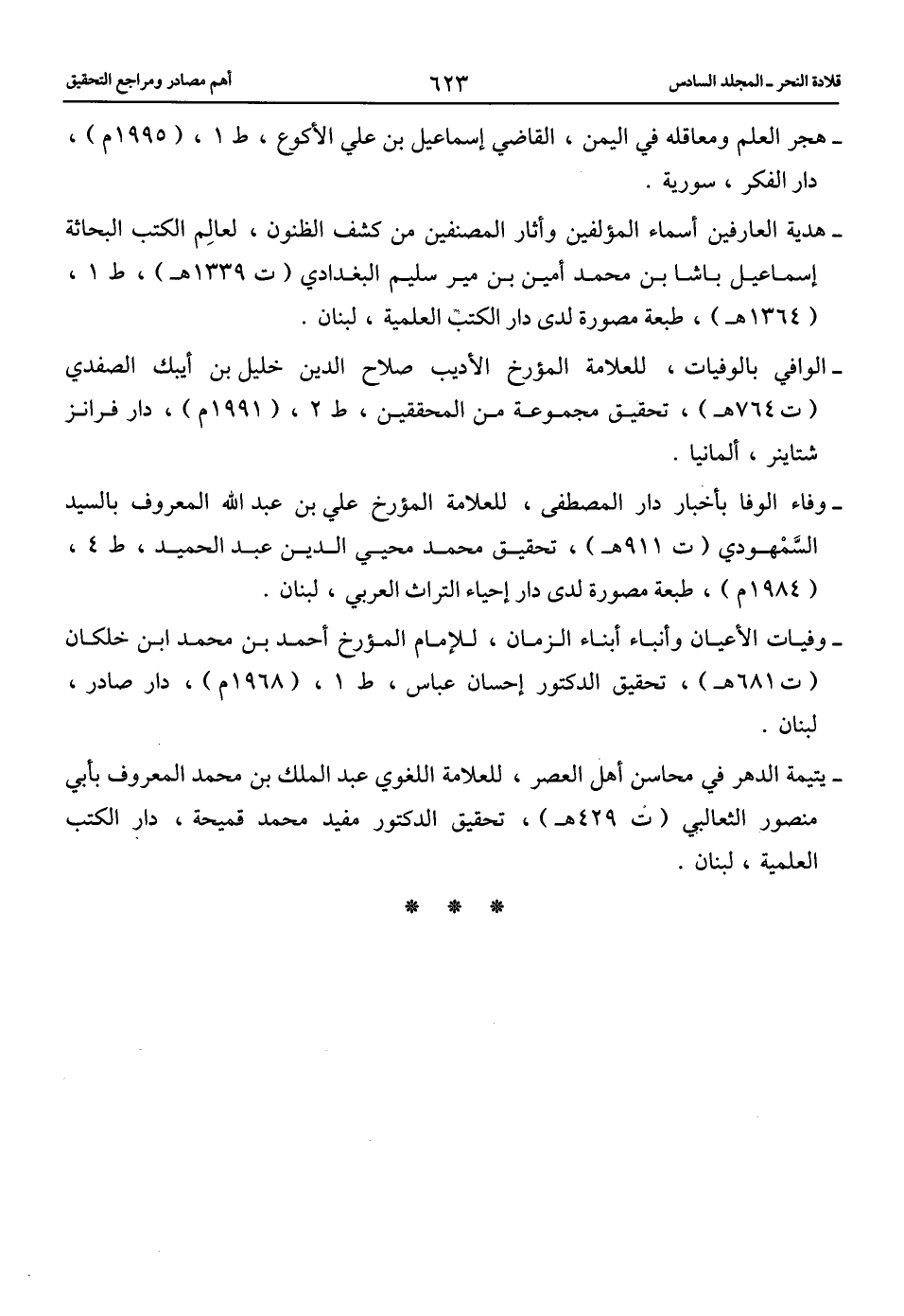 -الوافي بالوفيات، للعلامة المؤرخ الأديب صلاح الدين خليل بن أيبك الصفدي (ت 764 هـ)، تحقيق مجموعة من المحققين، ط 2، (1991 م)، دار فرانز شتاينر، ألمانيا.