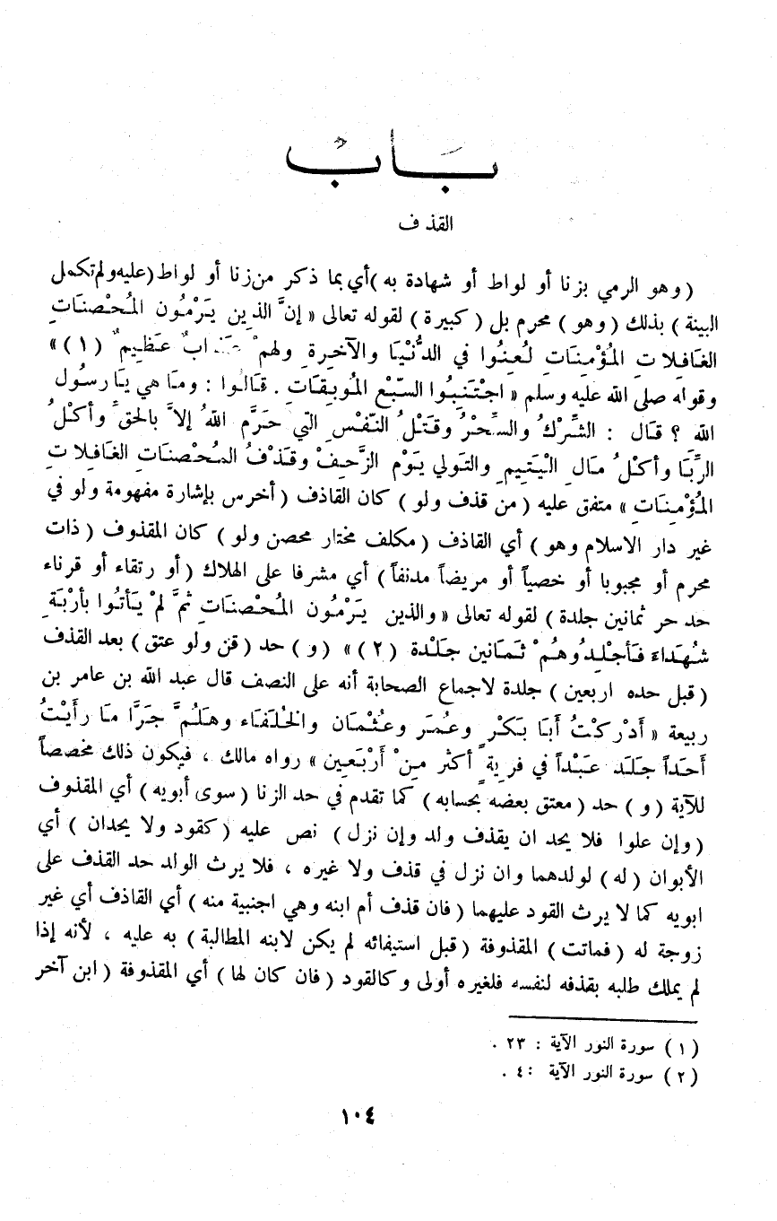 (بَابُ الْقَذْفِ وَهُوَ الرَّمْيُ بِزِنًا أَوْ لِوَاطٍ أَوْ شَهَادَةٍ بِهِ) أَيْ بِمَا ذُكِرَ مِنْ زِنًا أَوْ لِوَاطٍ (عَلَيْهِ وَلَمْ تَكْمُل الْبَيِّنَةُ) بِذَلِكَ (وَهُوَ) مُحَرَّمٌ بَلْ (كَبِيرَةٌ) لِقَوْلِهِ تَعَالَى {إِنَّ الَّذِينَ يَرْمُونَ الْمُحْصَنَاتِ الْغَافِلاتِ الْمُؤْمِنَاتِ لُعِنُوا فِي الدُّنْيَا وَالآخِرَةِ وَلَهُمْ عَذَابٌ عَظِيمٌ} [النور: ٢٣] وَقَوْلُهُ - صَلَّى اللَّهُ عَلَيْهِ وَسَلَّمَ - «اجْتَنِبُوا السَّبْعَ الْمُوبِقَاتِ قَالُوا: وَمَا هِيَ يَا رَسُولَ اللَّهِ؟ قَالَ: الشِّرْكُ وَالسِّحْرُ وَقَتْلُ النَّفْسِ الَّتِي حَرَّمَ اللَّهُ إلَّا بِالْحَقِّ وَأَكْلُ الرِّبَا وَأَكْلُ مَالِ الْيَتِيمِ وَالتَّوَلِّي يَوْمَ الزَّحْفِ وَقَذْفُ الْمُحْصَنَاتِ الْغَافِلَاتِ الْمُؤْمِنَاتِ» مُتَّفَقٌ عَلَيْهِ (مَنْ قَذَفَ وَلَوْ) كَانَ الْقَاذِفُ (أَخْرَسُ بِإِشَارَةٍ مَفْهُومَةٍ وَلَوْ فِي غَيْرِ دَارِ الْإِسْلَامِ وَهُوَ) .