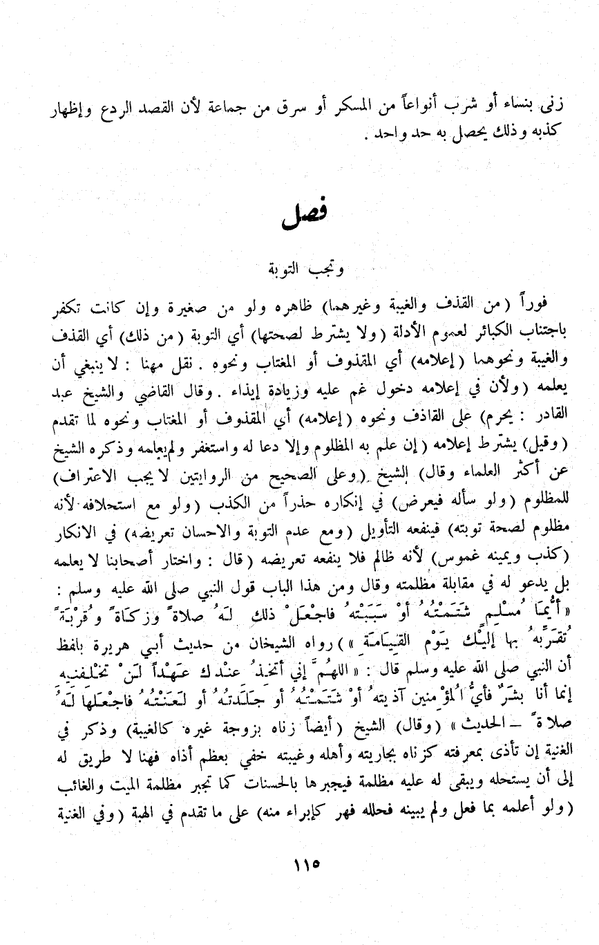 (فَصْل) (وَتَجِب التَّوْبَةُ) فَوْرًا (مِنْ الْقَذْفِ وَالْغِيبَةِ وَغَيْرِهِمَا) ظَاهِرُهُ وَلَوْ مِنْ صَغِيرَةٍ وَإِنْ كَانَتْ تُكَفِّرُ بِاجْتِنَابِ الْكَبَائِرِ لِعُمُومِ الْأَدِلَّةِ (وَلَا يَشْتَرِطُ لِصِحَّتِهَا) أَيْ التَّوْبَةِ (مِنْ ذَلِكَ) أَيْ: الْقَذْفِ وَالْغِيبَةِ وَنَحْوِهِمَا (إعْلَامُهُ) أَيْ الْمَقْذُوفِ أَوْ الْمُغْتَابِ وَنَحْوِهِ.