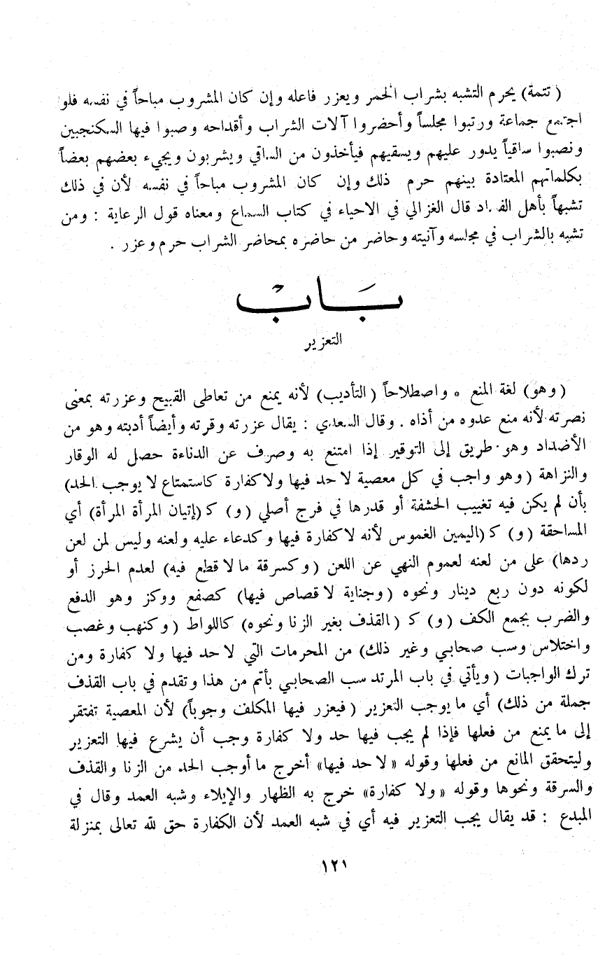 (بَابُ التَّعْزِيرِ وَهُوَ) لُغَةً الْمَنْعُ وَاصْطِلَاحًا (التَّأْدِيبُ) لِأَنَّهُ يَمْنَعُ مِنْ تَعَاطِي الْقَبِيحَ وَعَزَرْتُهُ بِمَعْنَى نَصَرْتُهُ لِأَنَّهُ مَنْعَ عَدُوّهُ مِنْ أَذَاهُ وَقَالَ السَّعْدِيُّ: يُقَالُ عَزَّرَتْهُ وَقَّرْتُهُ وَأَيْضًا أَدَّبْتُهُ وَهُوَ مِنْ الْأَضْدَادِ وَهُوَ طَرِيقٌ إلَى التَّوْقِيرِ إذَا امْتَنَعَ بِهِ وَصُرِفَ عَنْ الدَّنَاءَةِ حَصَلَ لَهُ الْوَقَارُ وَالنَّزَاهَةُ (وَهُوَ وَاجِبٌ فِي كُلِّ مَعْصِيَةٍ لَا حَدَّ فِيهَا وَلَا كَفَّارَةَ كَاسْتِمْتَاعٍ لَا يُوجِب الْحَدَّ) بِأَنْ لَمْ يَكُنْ فِيهِ تَغْيِيبُ الْحَشَفَةِ أَوْ قَدْرِهَا فِي فَرْجٍ أَصْلِيٍّ.