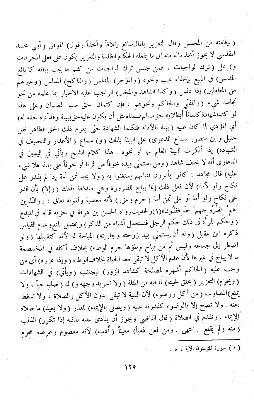 هَذَا كَلَامُ الشَّيْخِ وَيَأْتِي فِي الْيَمِينِ فِي الدَّعَاوَى أَنَّهُ لَا يَحْلِفُ شَاهِدٌ (وَمَنْ اسْتَمْنَى بِيَدِهِ خَوْفًا مِنْ الزِّنَا أَوْ خَوْفًا عَلَى بَدَنِهِ فَلَا شَيْءَ عَلَيْهِ) قَالَ مُجَاهِدٌ: كَانُوا يَأْمُرُونَ فِتْيَانَهُمْ يَسْتَغْنُوا بِهِ (وَلَا يَجِدُ ثَمَنَ أَمَةٍ إذَا لَمْ يَقْدِرْ عَلَى نِكَاحٍ وَلَوْ لِأَمَةٍ) لِأَنَّ فِعْلَ ذَلِكَ إنَّمَا يُبَاحُ لِلضَّرُورَةِ وَهِيَ مُنْدَفِعَةٌ بِذَلِكَ (وَإِلَّا) بِأَنْ قَدَرَ عَلَى نِكَاحٍ وَلَوْ أَمَةً أَوْ عَلَى ثَمَنِ أَمَةٍ (حَرُمَ وَعُزِّرَ) لِأَنَّهُ مَعْصِيَةٌ وَلِقَوْلِهِ تَعَالَى: {وَالَّذِينَ هُمْ لِفُرُوجِهِمْ حَافِظُونَ} [المؤمنون: ٥] وَلِحَدِيثٍ رَوَاهُ الْحَسَنُ بْنُ عَرَفَةَ فِي حِزْبِهِ قَالَهُ فِي الْمُبْدِعِ.