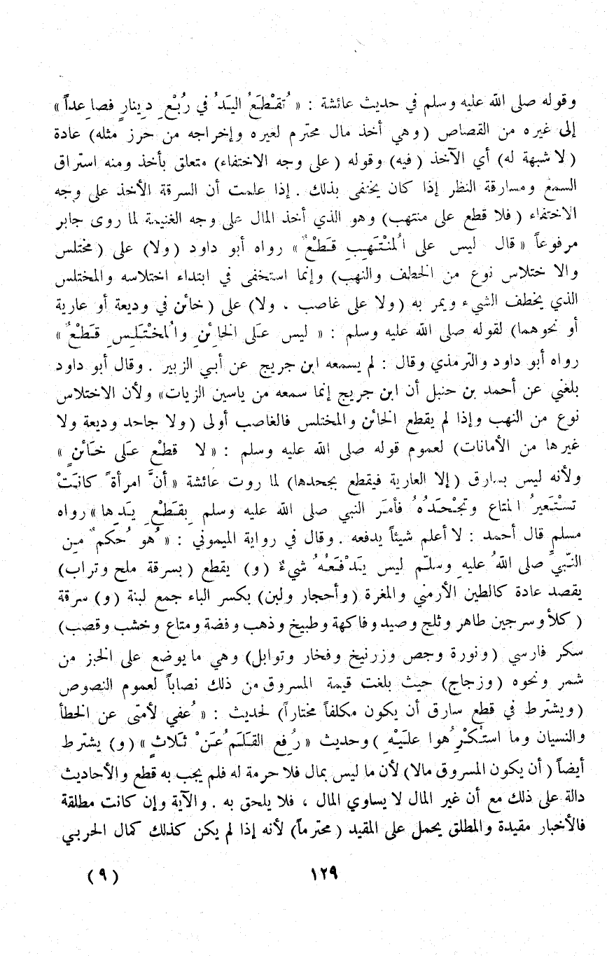 وَقَالَ فِي رِوَايَةِ الْمَيْمُونِيِّ: " هُوَ حُكْمٌ مِنْ النَّبِيِّ - صَلَّى اللَّهُ عَلَيْهِ وَسَلَّمَ - لَيْسَ يَدْفَعُهُ شَيْءٌ (وَ) يُقْطَعُ (بِسَرِقَةِ مِلْحٍ وَتُرَابٍ) يَقْصِدُ عَادَةً كَالطِّينِ الْأَرْمَنِيِّ وَالْمَغَرَةِ (وَأَحْجَارٍ وَلَبِنٍ) بِكَسْرِ الْبَاءِ جَمْعُ لَبِنَةٍ (وَ) سَرِقَةُ (كَلَأٍ وَسِرْجِينٍ طَاهِرٍ وَثَلْجٍ وَصَيْدٍ وَفَاكِهَةٍ وَطَبِيخٍ وَذَهَبٍ وَفِضَّةٍ وَمَتَاعٍ وَخَشَبٍ وَقَصَبٍ) سُكَّرٍ فَارِسِيٍّ (وَنَوْرَةٍ وَجَصٍّ وَزَرْنِيخٍ وَفُخَّارٍ وَتَوَابِلَ) وَهِيَ مَا يُوضَعُ عَلَى الْخُبْزِ مِنْ شَمَرٍ وَنَحْوِهِ (وَزُجَاجٍ) حَيْثُ بَلَغَتْ قِيمَةُ الْمَسْرُوقِ مِنْ ذَلِكَ نِصَابًا لِعُمُومِ النُّصُوصِ (وَيُشْتَرَطُ فِي قَطْعِ سَارِقٍ أَنْ يَكُونَ مُكَلَّفًا مُخْتَارًا) لِحَدِيثِ: «عُفِيَ لِأُمَّتِي عَنْ الْخَطَأِ وَالنِّسْيَانِ وَمَا اُسْتُكْرِهُوا عَلَيْهِ» وَحَدِيثُ «رُفِعَ الْقَلَمُ عَنْ ثَلَاثٍ» .