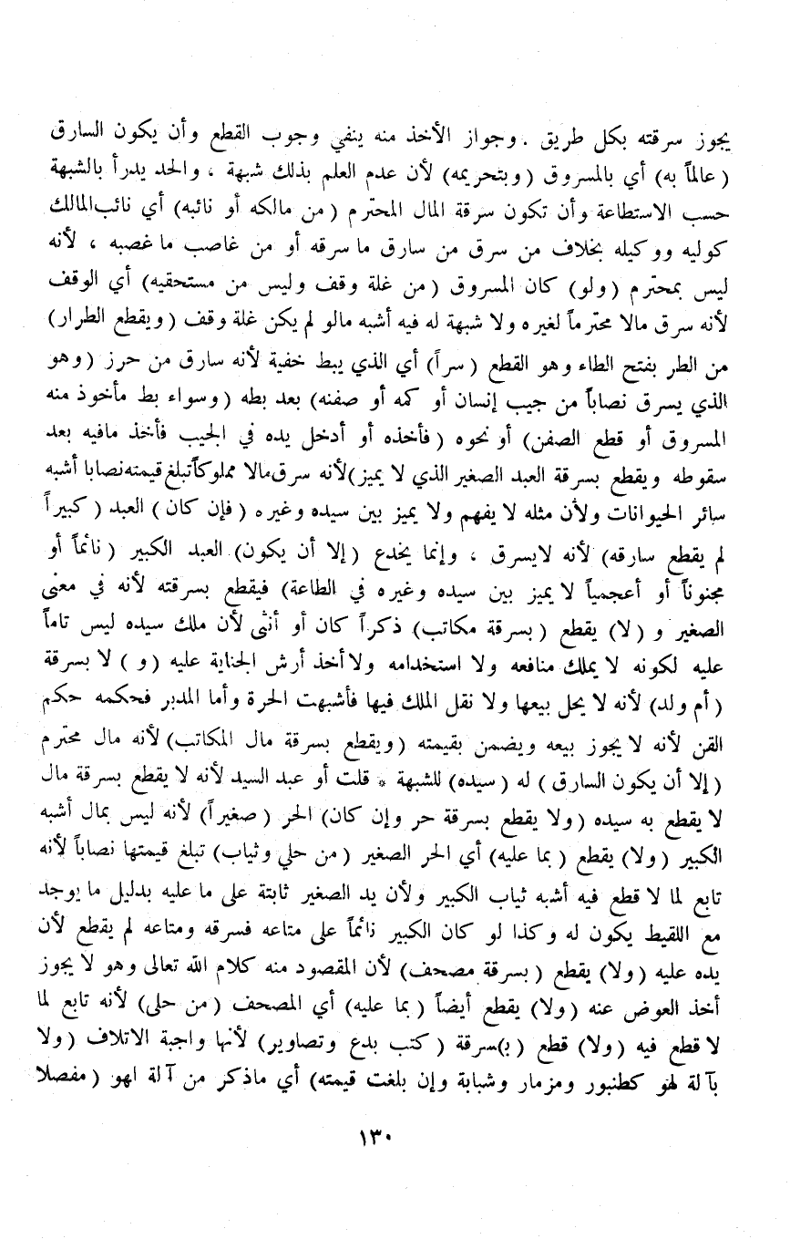 وَأَنْ يَكُونَ السَّارِقُ (عَالِمًا بِهِ) أَيْ بِالْمَسْرُوقِ (وَبِتَحْرِيمِهِ) لِأَنَّ عَدَمَ الْعِلْمِ بِذَلِكَ شُبْهَةٌ وَالْحَدُّ يُدْرَأُ بِالشُّبْهَةِ حَسَبَ الِاسْتِطَاعَةِ وَأَنْ تَكُونَ سَرِقَةُ الْمَالِ الْمُحْتَرَمِ (مِنْ مَالِكِهِ أَوْ نَائِبِهِ) أَيْ نَائِبِ الْمَالِكِ كَوَلِيِّهِ وَوَكِيلِهِ بِخِلَافِ مَنْ سَرَقَ مِنْ سَارِقٍ مَا سَرَقَهُ أَوْ مِنْ غَاصِبٍ مَا غَصَبَهُ، لِأَنَّهُ لَيْسَ بِمُحْتَرَمِ (وَلَوْ) كَانَ الْمَسْرُوقُ (مِنْ غَلَّةِ وَقْفٍ وَلَيْسَ مِنْ مُسْتَحَقِّيهِ) أَيْ الْوَقْفِ لِأَنَّهُ سَرَقَ مَالًا مُحْتَرَمًا لِغَيْرِهِ وَلَا شُبْهَةَ لَهُ فِيهِ أَشْبَهَ مَا لَوْ لَمْ يَكُنْ غَلَّةَ وَقْفٍ (وَيُقْطَعُ الطِّرَارُ) مِنْ الطَّرِّ بِفَتْحِ الطَّاءِ وَهُوَ الْقَطْعُ (سِرًّا) أَيْ الَّذِي يُبَطُّ خُفْيَةً لِأَنَّهُ سَارِقٌ مِنْ حِرْزٍ (وَهُوَ الَّذِي يَسْرِقُ نِصَابًا مِنْ جَيْبِ إنْسَانٍ أَوْ كُمِّهِ أَوْ صُفْنِهِ) بَعْدَ بَطِّهِ (وَسَوَاءُ بَطَّ مَأْخُوذٌ مِنْهُ الْمَسْرُوقَ أَوْ قَطْعَ الصُّفْنَ) أَوْ نَحْوَهُ (فَأَخَذَهُ أَوْ أَدْخَلَ يَدَهُ فِي الْجَيْبِ فَأَخَذَ مَا فِيهِ بَعْدَ سُقُوطِهِ وَيُقْطَعُ بِسَرِقَةِ الْعَبْدِ الصَّغِيرِ الَّذِي لَا يُمَيِّزُ) لِأَنَّهُ سَرَقَ مَالًا مَمْلُوكًا تَبْلُغُ قِيمَتُهُ نِصَابًا أَشْبَهَ سَائِرَ الْحَيَوَانَاتِ وَلِأَنَّ مِثْلَهُ لَا يَفْهَمُ وَلَا يُمَيِّزُ بَيْن سَيِّدِهِ وَغَيْرِهِ (فَإِنْ كَانَ) الْعَبْدُ (كَبِيرًا لَمْ يُقْطَعْ سَارِقُهُ) لِأَنَّهُ لَا يُسْرَقُ.