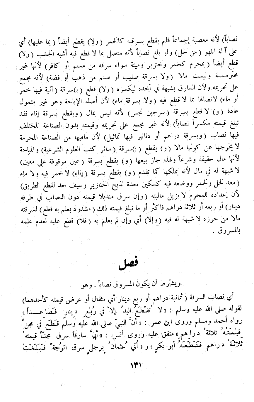 (فَصْلٌ وَيُشْتَرَطُ أَنْ يَكُونَ الْمَسْرُوقُ نِصَابًا وَهُوَ) أَيْ نِصَابُ السَّرِقَةِ (ثَلَاثَةُ دَرَاهِمَ أَوْ رُبُعُ دِينَارٍ أَيْ مِثْقَالُ أَوْ عَرَضُ قِيمَتُهُ كَأَحَدِهِمَا) لِقَوْلِهِ - صَلَّى اللَّهُ عَلَيْهِ وَسَلَّمَ -: «لَا تُقْطَعُ الْيَدُ إلَّا فِي رُبْعِ دِينَارٍ فَصَاعِدًا» رَوَاهُ أَحْمَدُ وَمُسْلِمٌ.