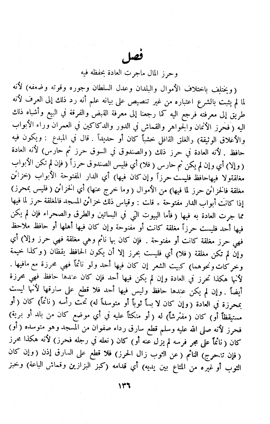 (فَصْل وَحِرْزُ الْمَالِ مَا جَرَتْ الْعَادَةُ بِحِفْظِهِ فِيهِ وَيَخْتَلِفُ بِاخْتِلَافِ الْأَمْوَالِ وَالْبُلْدَانِ وَعَدْلِ السُّلْطَانِ وَجَوْرِهِ وَقُوَّتِهِ وَضَعْفِهِ) لِأَنَّهُ لَمَّا لَمْ يَثْبُتْ بِالشَّرْعِ اعْتِبَارُهُ مِنْ غَيْرِ تَنْصِيصٍ عَلَى بَيَانِهِ عُلِمَ أَنَّهُ رَدَّ ذَلِكَ إلَى الْعُرْفِ لِأَنَّهُ طَرِيقٌ إلَى مَعْرِفَتِهِ فَرَجَعَ إلَيْهِ كَمَا رَجَعْنَا إلَى مَعْرِفَةِ الْقَبْضِ وَالْفِرْقَةِ فِي الْبَيْعِ وَأَشْبَاهِ ذَلِكَ إلَيْهِ (فَحِرْزُ الْأَثْمَانِ وَالْجَوَاهِرِ وَالْقُمَاشِ فِي الدُّورِ وَالدَّكَاكِينِ فِي الْعُمْرَانِ وَرَاءَ الْأَبْوَابِ وَالْأَغْلَاقِ الْوَثِيقَةِ) وَالْغَلَقِ الْقَافِلِ خَشَبًا كَانَ أَوْ حَدِيدًا.