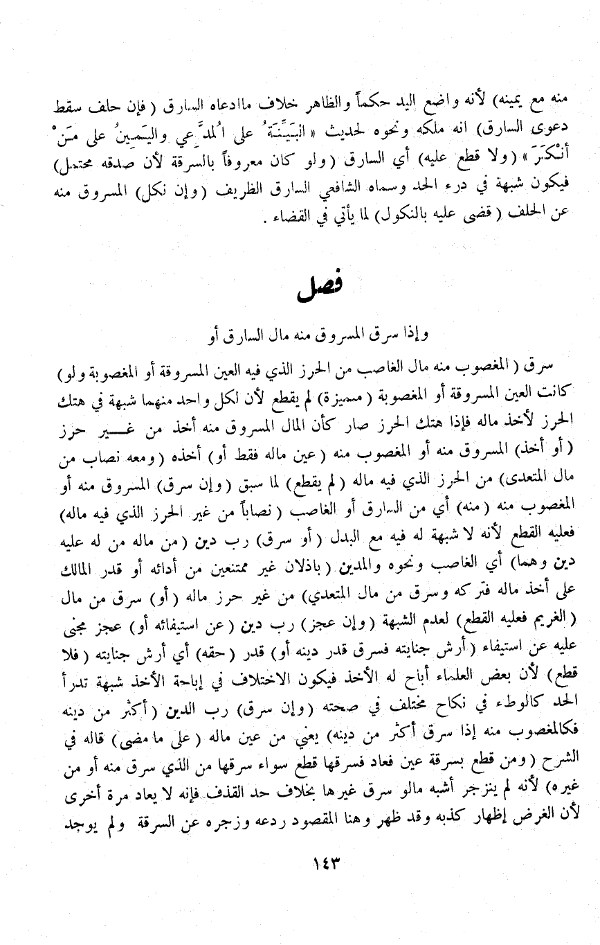 (فَصْل وَإِذَا سَرَقَ الْمَسْرُوقُ مِنْهُ مَالَ السَّارِقِ) أَوْ سَرَقَ (الْمَغْصُوبُ مِنْهُ مَالَ الْغَاصِبِ مِنْ الْحِرْزِ الَّذِي فِيهِ الْعَيْنُ الْمَسْرُوقَةُ أَوْ الْمَغْصُوبَةُ وَلَوْ) كَانَتْ الْعَيْنُ الْمَسْرُوقَةُ أَوْ الْمَغْصُوبَةُ (مُمَيَّزَةً) لَمْ يُقْطَعْ لِأَنَّ لِكُلِّ وَاحِدٍ مِنْهُمَا شُبْهَةٌ فِي هَتْكِ الْحِرْزِ لِأَخْذِ مَالِهِ فَإِذَا هَتَكَ الْحِرْزَ صَارَ كَأَنَّ الْمَالَ الْمَسْرُوقَ مِنْهُ أَخَذَ مِنْ غَيْرِ حِرْزٍ (أَوْ أَخَذَ) الْمَسْرُوقَ مِنْهُ أَوْ الْمَغْصُوبَ مِنْهُ (عَيْنَ مَالِهِ فَقَطْ أَوْ) أَخَذَهُ (وَمَعَهُ نِصَابٌ مِنْ مَالِ الْمُتَعَدِّي) مِنْ الْحِرْزِ الَّذِي فِيهِ مَالُهُ (لَمْ يُقْطَعْ) لِمَا سَبَقَ (وَإِنْ سَرَقَ) الْمَسْرُوقُ مِنْهُ أَوْ الْمَغْصُوبُ (مِنْهُ) أَيْ مِنْ السَّارِقِ أَوْ الْغَاصِبِ (نِصَابًا مِنْ غَيْرِ الْحِرْزِ الَّذِي فِيهِ مَالُهُ) فَعَلَيْهِ الْقَطْعُ لِأَنَّهُ لَا شُبْهَةَ لَهُ فِيهِ مَعَ الْبَدَلِ (أَوْ سَرَقَ) رَبَّ دَيْنٍ (مِنْ مَالِهِ مَنْ لَهُ عَلَيْهِ دَيْنٌ وَهُمَا) أَيْ الْغَاصِبُ وَنَحْوُهُ وَالْمَدِينُ (بَاذِلَانِ غَيْرَ مُمْتَنِعَيْنِ مِنْ أَدَائِهِ أَوْ قَدَرَ الْمَالِكُ عَلَى أَخْذِ مَالِهِ فَتَرَكَهُ وَسَرَقَ مِنْ مَالِ الْمُتَعَدِّي) مِنْ غَيْرِ حِرْزِ مَالِهِ (أَوْ) سَرَقَ مِنْ مَالِ (الْغَرِيمِ فَعَلَيْهِ الْقَطْعُ) لِعَدَمِ الشُّبْهَةِ.