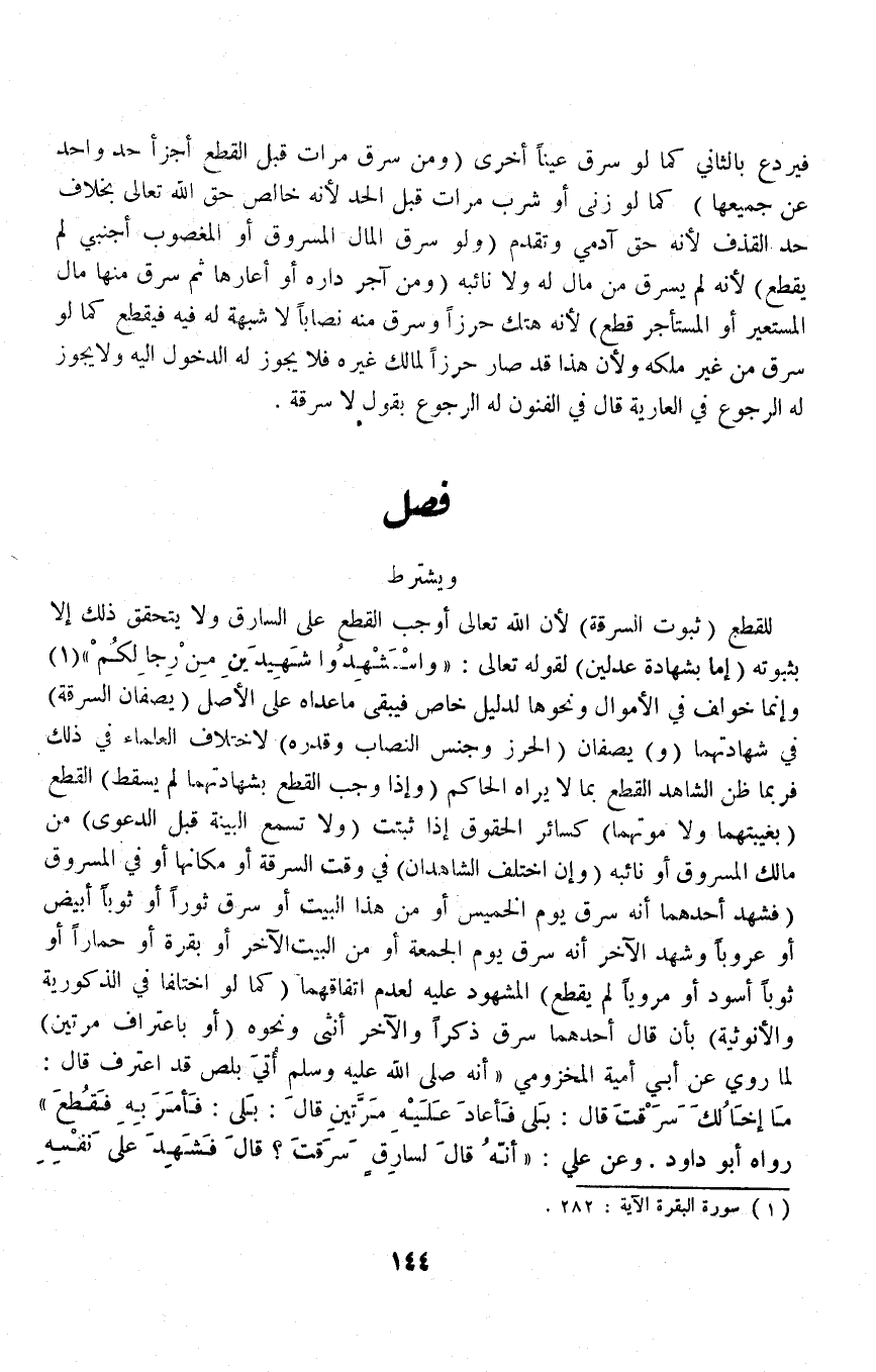 (فَصْلٌ وَيُشْتَرَطُ) لِلْقَطْعِ (ثُبُوتُ السَّرِقَةِ) لِأَنَّ اللَّهَ تَعَالَى أَوْجَبَ الْقَطْعَ عَلَى السَّارِق وَلَا يَتَحَقَّقُ ذَلِكَ إلَّا بِثُبُوتِهِ (إمَّا بِشَهَادَةِ عَدْلَيْنِ) لِقَوْلِهِ تَعَالَى: {وَاسْتَشْهِدُوا شَهِيدَيْنِ مِنْ رِجَالِكُمْ} [البقرة: ٢٨٢] وَإِنَّمَا خُولِفَ فِي الْأَمْوَالِ وَنَحْوِهَا لِدَلِيلٍ خَاصٍّ فَيَبْقَى مَا عَدَاهُ عَلَى الْأَصْل (يَصِفَانِ السَّرِقَةَ) فِي شَهَادَتِهِمَا (وَ) يَصِفَانِ (الْحِرْزَ وَجِنْسَ النِّصَابِ وَقَدْرَهُ) لِاخْتِلَافِ الْعُلَمَاءِ فِي ذَلِكَ فَرُبَّمَا ظَنَّ الشَّاهِدُ الْقَطْعَ بِمَا لَا يَرَاهُ الْحَاكِمُ.