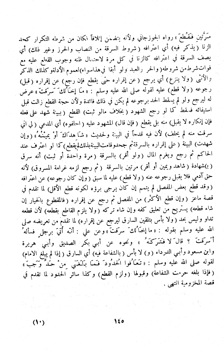 (وَإِنْ قُطِعَ الْأَكْثَرُ) مِنْ الْمَفْصِلِ ثُمَّ رَجَعَ عَنْ إقْرَارِهِ (فَالْمَقْطُوعُ بِالْخِيَارِ إنْ شَاءَ قَطَعَهُ) يَسْتَرِيحُ مِنْ تَعْلِيقِ كَفّه وَإِنْ شَاءَ تَرَكَهُ (وَلَا يُلْزَمُ الْقَاطِعُ بِقَطْعِهِ) لِأَنَّ قَطْعَهُ تَدَاوٍ وَلَيْسَ بِحَدٍّ (وَلَا بَأْسَ بِتَلْقِينِ السَّارِقِ لِيَرْجِعَ عَنْ إقْرَارِهِ) لِمَا تَقَدَّمَ مِنْ تَعْرِيضِهِ - صَلَّى اللَّهُ عَلَيْهِ وَسَلَّمَ - بِقَوْلِهِ: «مَا إخَالُكَ سَرَقْتَ» وَعَنْ عَلِيٍّ: أَنَّهُ أُتِيَ بِرَجُلٍ فَسَأَلَهُ أَسَرَقْتَ؟ قَالَ لَا فَتَرَكَهُ " وَنَحْوَهُ عَنْ أَبِي بَكْرٍ الصِّدِّيقِ وَأَبِي هُرَيْرَةَ وَابْنِ مَسْعُودٍ وَأَبِي الدَّرْدَاءِ (وَ) لَا بَأْسَ (بِالشَّفَاعَةِ فِيهِ) أَيْ السَّارِقِ (إذَا لَمْ يَبْلُغْ الْإِمَامُ) لِقَوْلِهِ - صَلَّى اللَّهُ عَلَيْهِ وَسَلَّمَ -: «تَعَافُوا الْحُدُودَ فَمَا بَلَغَنِي مِنْ حَدٍّ وَجَبَ» (فَإِذَا بَلَغَهُ حُرِّمَتْ الشَّفَاعَةُ) وَقَبُولُهَا (وَلَزِمَ الْقَطْعُ) وَكَذَا سَائِرُ الْحُدُودِ لِمَا تَقَدَّمَ فِي قِصَّةِ الْمَخْزُومِيَّةِ انْتَهَى.
