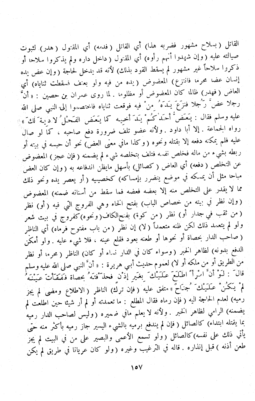 الْقَاتِلِ (بِسِلَاحِ مَشْهُورٍ فَضَرَبَهُ هَذَا) أَيْ الْقَاتِلُ (فَدَمُهُ) أَيْ الْمَقْتُولُ (هَدْرٌ) لِثُبُوتِ صِيَالَتِهِ عَلَيْهِ (وَإِنْ شَهِدُوا أَنَّهُمْ رَأَوْهُ) أَيْ الْمَقْتُولَ (دَاخِلًا دَارِهِ وَلَمْ يَذْكُرُوا سِلَاحًا) أَوْ ذَكَرُوا سِلَاحًا (غَيْرَ مَشْهُورٍ لَمْ يَسْقُطْ الْقَوَدُ بِذَلِكَ) لِأَنَّهُ قَدْ يَدْخُلُ لِحَاجَةٍ.