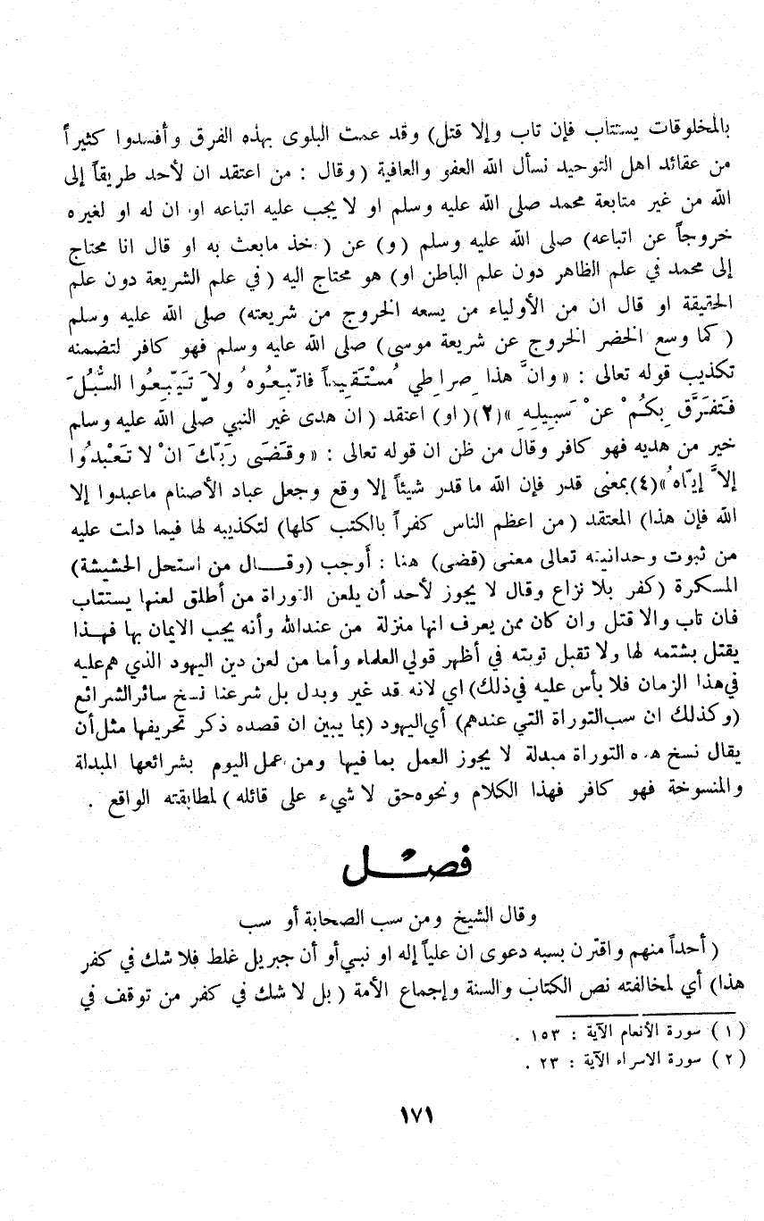 فَصْلُ (وَقَالَ) الشَّيْخُ (وَمَنْ سَبَّ الصَّحَابَةَ أَوْ) سَبَّ (أَحَدًا مِنْهُمْ وَاقْتَرَنَ بِسَبِّهِ دَعْوَى أَنَّ عَلِيًّا إلَهٌ أَوْ نَبِيٌّ أَوْ أَنَّ جِبْرِيلَ غَلِطَ فَلَا شَكَّ فِي كُفْرِ هَذَا) أَيْ لِمُخَالَفَتِهِ نَصَّ الْكِتَابِ وَالسُّنَّةِ وَإِجْمَاعِ الْأُمَّةِ (بَلْ لَا شَكَّ فِي كُفْرِ مَنْ تَوَقَّفَ فِي