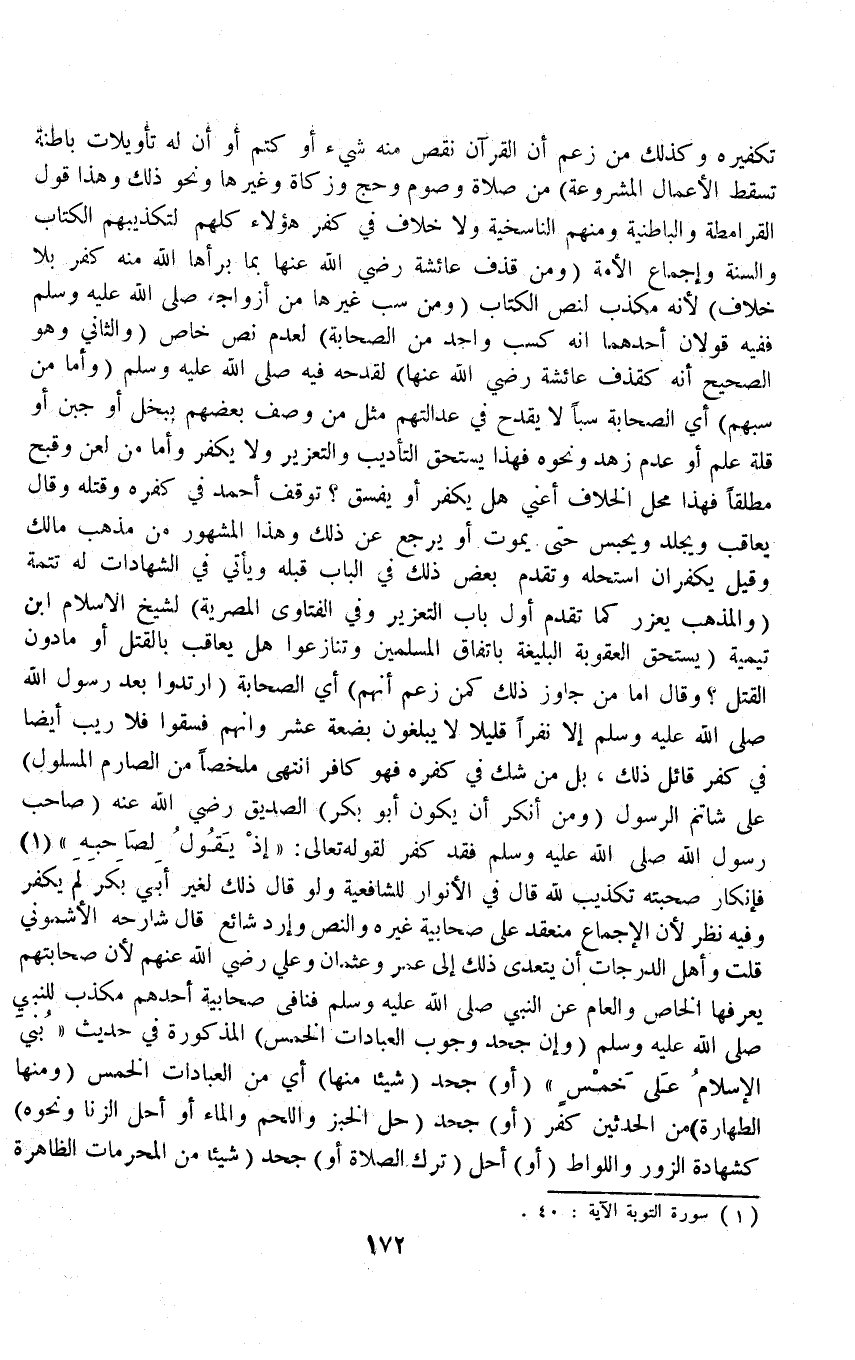 تَكْفِيرِهِ وَكَذَلِكَ مَنْ زَعَمَ أَنَّ الْقُرْآنَ نَقَصَ مِنْهُ شَيْءٌ أَوْ كُتِمَ أَوْ أَنَّ لَهُ تَأْوِيلَاتٍ بَاطِنَةً تُسْقِطُ الْأَعْمَالَ الْمَشْرُوعَةَ) مِنْ صَلَاةٍ وَصَوْمٍ وَحَجٍّ وَزَكَاةٍ وَغَيْرِهَا (وَنَحْوِ ذَلِكَ وَهَذَا قَوْلُ الْقَرَامِطَةِ وَالْبَاطِنِيَّةِ وَمِنْهُمْ النَّاسِخِيَّةُ وَلَا خِلَافَ فِي كُفْرِ هَؤُلَاءِ كُلِّهِمْ) لِتَكْذِيبِهِمْ الْكِتَابَ وَالسُّنَّةَ وَإِجْمَاعَ الْأُمَّةِ.