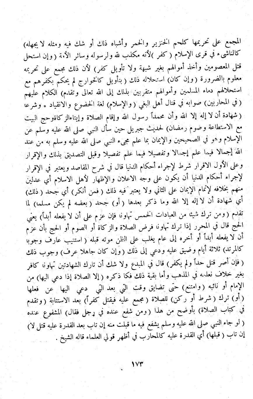 (وَالْإِسْلَامُ) لُغَةً الْخُضُوعُ وَالِانْقِيَادُ وَشَرْعًا (شَهَادَةُ أَنْ لَا إلَهَ إلَّا اللَّهُ وَأَنَّ مُحَمَّدًا رَسُولُ اللَّهِ وَإِقَامِ الصَّلَاةِ وَإِيتَاءِ الزَّكَاةِ وَحَجِّ الْبَيْتِ مَعَ الِاسْتِطَاعَةِ وَصَوْمِ رَمَضَانَ) لِحَدِيثِ جِبْرِيلَ حِين سَأَلَ النَّبِيَّ - صَلَّى اللَّهُ عَلَيْهِ وَسَلَّمَ - عَنْ الْإِسْلَامِ وَهُوَ فِي الصَّحِيحَيْنِ وَالْإِيمَانُ بِمَا عُلِمَ مَجِيءُ النَّبِيَّ - صَلَّى اللَّهُ عَلَيْهِ وَسَلَّمَ - بِهِ مِنْ عِنْدِ اللَّهِ إجْمَالًا فِيمَا عُلِمَ إجْمَالًا، وَتَفْصِيلًا فِيمَا عُلِمَ تَفْصِيلًا وَقِيلَ التَّصْدِيقُ بِذَلِكَ وَالْإِقْرَارُ وَعَلَى الْأَوَّلِ الْإِقْرَارُ شَرْطٌ لِإِجْرَاءِ أَحْكَامِ الدُّنْيَا قَالَ فِي شَرْحِ الْمَقَاصِدِ وَيُعْتَبَرُ فِي الْإِقْرَارِ لِإِجْرَاءِ أَحْكَامِ الدُّنْيَا أَنْ يَكُونَ عَلَى وَجْهِ الْإِعْلَانِ وَالْإِظْهَارِ لِأَهْلِ الْإِسْلَامِ أَيْ عَدْلَيْنِ مِنْهُمْ بِخِلَافِهِ لِإِتْمَامِ الْإِيمَانِ عَلَى الثَّانِي وَلَا يُعْتَبَرُ فِيهِ ذَلِكَ (فَمَنْ أَنْكَرَ) أَيْ جَحَدَ (ذَلِكَ) أَيْ شَهَادَةَ أَنْ لَا إلَهَ إلَّا اللَّهُ وَمَا ذُكِرَ بَعْدَهَا (أَوْ) جَحَدَ (بَعْضَهُ لَمْ يَكُنْ مُسْلِمًا) لِمَا تَقَدَّمَ (وَمَنْ تَرَكَ شَيْئًا مِنْ الْعِبَادَاتِ الْخَمْسِ تَهَاوُنًا فَإِنْ عَزَمَ عَلَى أَنْ لَا يَفْعَلَهُ أَبَدًا) يَعْنِي الْحَجَّ قَالَ فِي الْمُحَرَّرِ إذَا تَرَكَ تَهَاوُنًا فَرْضَ الصَّلَاةِ وَالزَّكَاةِ أَوْ الصَّوْمِ أَوْ الْحَجِّ بِأَنْ عَزَمَ أَنْ لَا يَفْعَلَهُ أَبَدًا أَوْ أَخَّرَهُ إلَى عَامٍ يَغْلِبُ عَلَى الظَّنِّ مَوْتُهُ قَبْلَهُ (اُسْتُتِيبَ عَارِفٌ وُجُوبًا كَالْمُرْتَدِّ) ثَلَاثَةَ أَيَّامٍ وَضُيِّقَ عَلَيْهِ وَدُعِيَ إلَى ذَلِكَ (وَإِنْ كَانَ جَاهِلًا عُرِّفَ) وُجُوبُ ذَلِكَ.