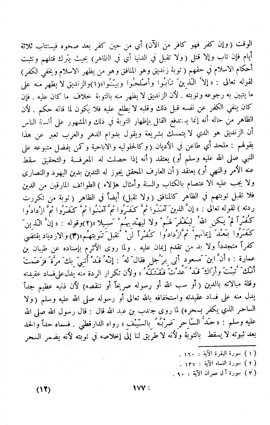 (وَلَا) تُقْبَلُ أَيْضًا فِي الظَّاهِرِ تَوْبَةُ (مَنْ تَكَرَّرَتْ رِدَّتُهُ) لِقَوْلِهِ تَعَالَى: {إِنَّ الَّذِينَ آمَنُوا ثُمَّ كَفَرُوا ثُمَّ آمَنُوا ثُمَّ كَفَرُوا ثُمَّ ازْدَادُوا كُفْرًا لَمْ يَكُنِ اللَّهُ لِيَغْفِرَ لَهُمْ وَلا لِيَهْدِيَهُمْ سَبِيلا} [النساء: ١٣٧] وَقَوْلِهِ: {إِنَّ الَّذِينَ كَفَرُوا بَعْدَ إِيمَانِهِمْ ثُمَّ ازْدَادُوا كُفْرًا لَنْ تُقْبَلَ تَوْبَتُهُمْ} [آل عمران: ٩٠] وَالِازْدِيَادُ يَقْتَضِي كُفْرًا مُتَجَدِّدًا وَلَا بُدَّ مِنْ تَقَدُّمِ إيمَانٍ عَلَيْهِ.