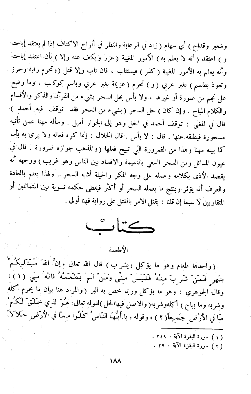 ِ وَاحِدُهَا طَعَامٌ وَهُوَ مَا يُؤْكَلُ وَيُشْرَبُ) قَالَ اللَّهُ تَعَالَى {إِنَّ اللَّهَ مُبْتَلِيكُمْ بِنَهَرٍ فَمَنْ شَرِبَ مِنْهُ فَلَيْسَ مِنِّي وَمَنْ لَمْ يَطْعَمْهُ فَإِنَّهُ مِنِّي} [البقرة: ٢٤٩] وَقَالَ الْجَوْهَرِيُّ: وَهُوَ مَا يُؤْكَلُ وَرُبَّمَا خُصَّ بِهِ الْبُرُّ (وَالْمُرَادُ هُنَا بَيَانُ مَا يَحْرُمُ أَكْلُهُ وَشُرْبُهُ وَمَا يُبَاحُ) أَكْلُهُ وَشُرْبُهُ (وَالْأَصْلُ فِيهَا الْحَلُّ) لِقَوْلِهِ تَعَالَى {هُوَ الَّذِي خَلَقَ لَكُمْ مَا فِي الأَرْضِ جَمِيعًا} [البقرة: ٢٩] وَقَوْلِهِ {يَا أَيُّهَا النَّاسُ كُلُوا مِمَّا فِي الأَرْضِ حَلالا طَيِّبًا} [البقرة: ١٦٨]