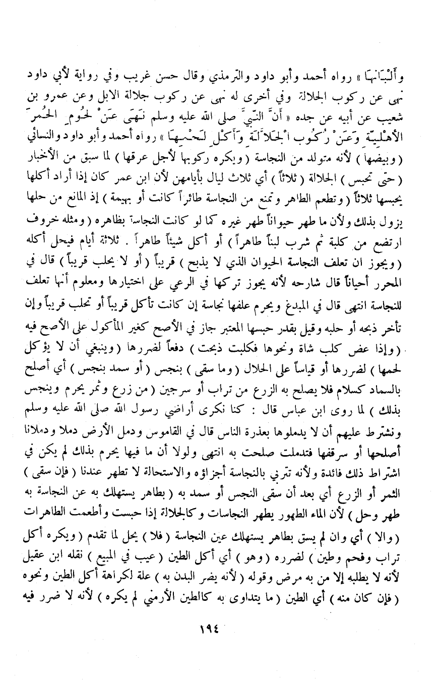 وَعَنْ عَمْرِو بْنِ شُعَيْبٍ عَنْ أَبِيهِ عَنْ جَدِّهِ «أَنَّ النَّبِيَّ - صَلَّى اللَّهُ عَلَيْهِ وَسَلَّمَ - نَهَى عَنْ لُحُومِ الْحُمُرِ الْأَهْلِيَّةِ وَعَنْ رُكُوبِ الْجَلَّالَةِ وَأَكْلِ لَحْمِهَا» رَوَاهُ أَحْمَدُ وَأَبُو دَاوُد وَالنَّسَائِيُّ (وَبِيضِهَا) لِأَنَّهُ مُتَوَلِّدٌ مِنْ النَّجَاسَةِ.