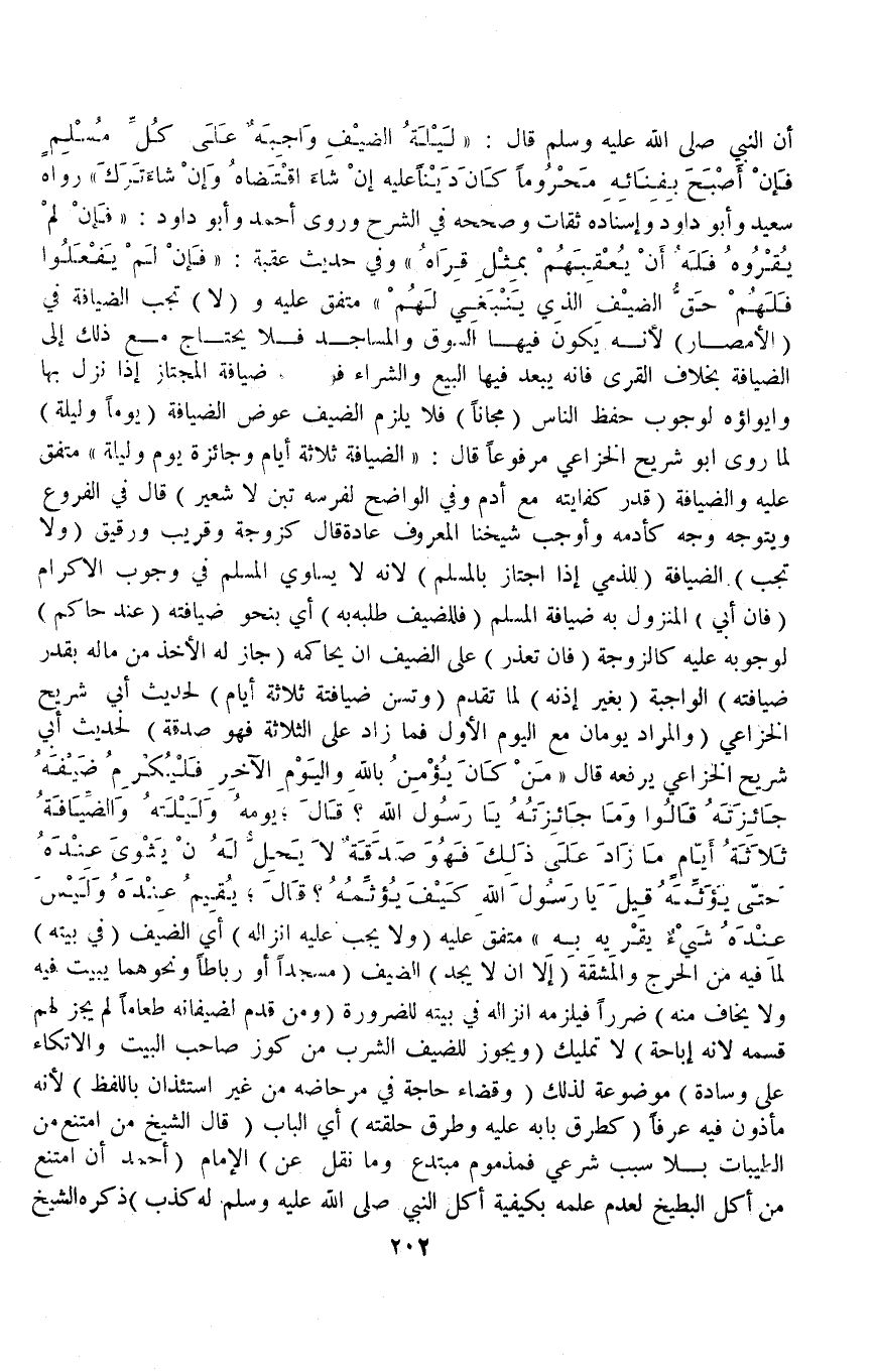 أَنَّ النَّبِيَّ - صَلَّى اللَّهُ عَلَيْهِ وَسَلَّمَ - قَالَ: «لَيْلَةُ الضَّيْفِ وَاجِبَةٌ عَلَى كُلِّ مُسْلِمٍ فَإِنْ أَصْبَحَ بِفِنَائِهِ مَحْرُومًا كَانَ دَيْنًا عَلَيْهِ إنْ شَاءَ اقْتَضَاهُ وَإِنْ شَاءَ تَرَكَ» رَوَاهُ سَعِيدٌ وَأَبُو دَاوُد وَإِسْنَادُهُ ثِقَاتٌ وَصَحَّحَهُ فِي الشَّرْحِ.