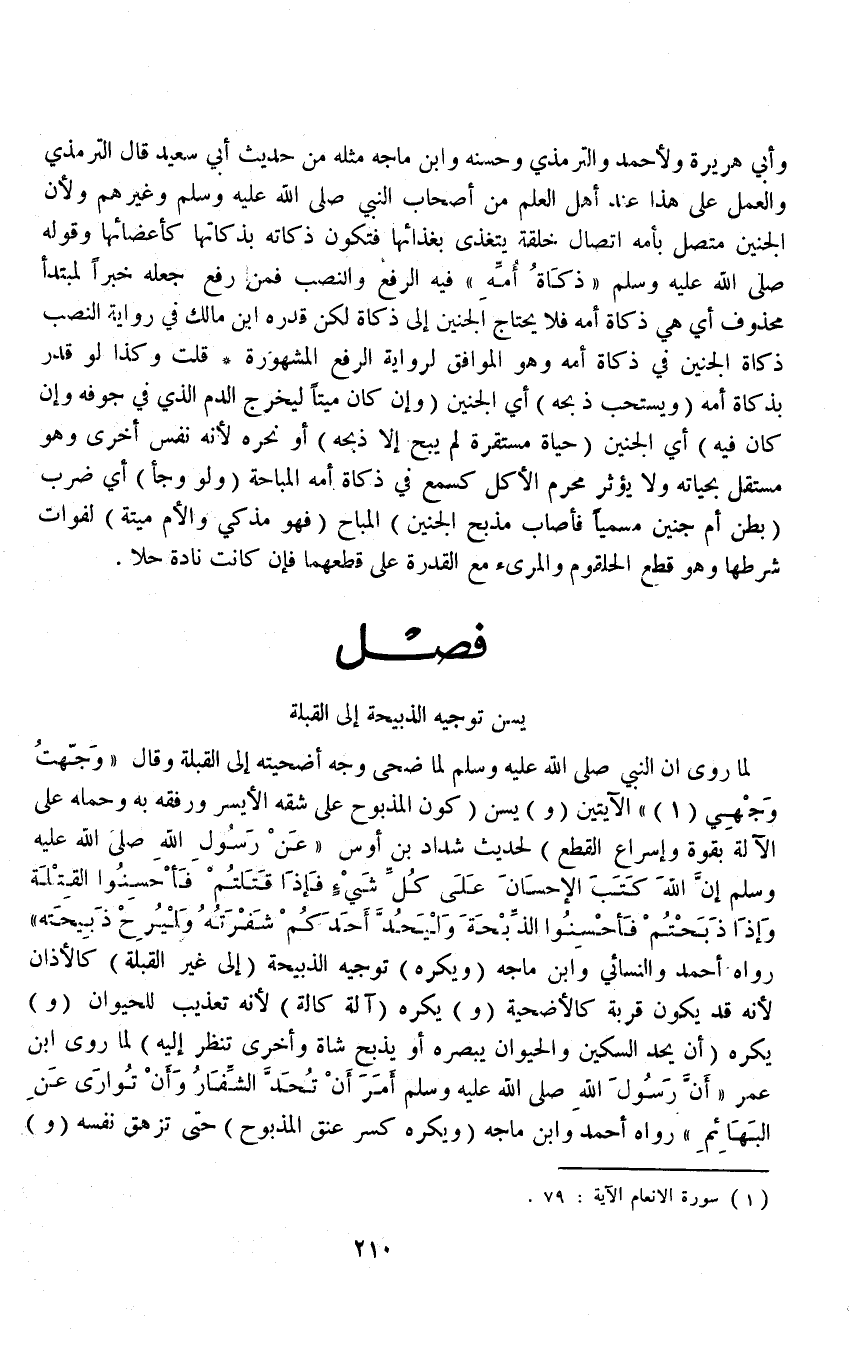 (فَصْلٌ يُسَنُّ تَوْجِيهُ الذَّبِيحَةِ إلَى الْقِبْلَةِ) لِمَا رُوِيَ «أَنَّ النَّبِيَّ - صَلَّى اللَّهُ عَلَيْهِ وَسَلَّمَ - لَمَّا ضَحَّى وَجَّهَ أُضْحِيَّتَهُ إلَى الْقِبْلَةِ وَقَالَ {وَجَّهْتُ وَجْهِيَ} [الأنعام: ٧٩] » الْآيَتَيْنِ.