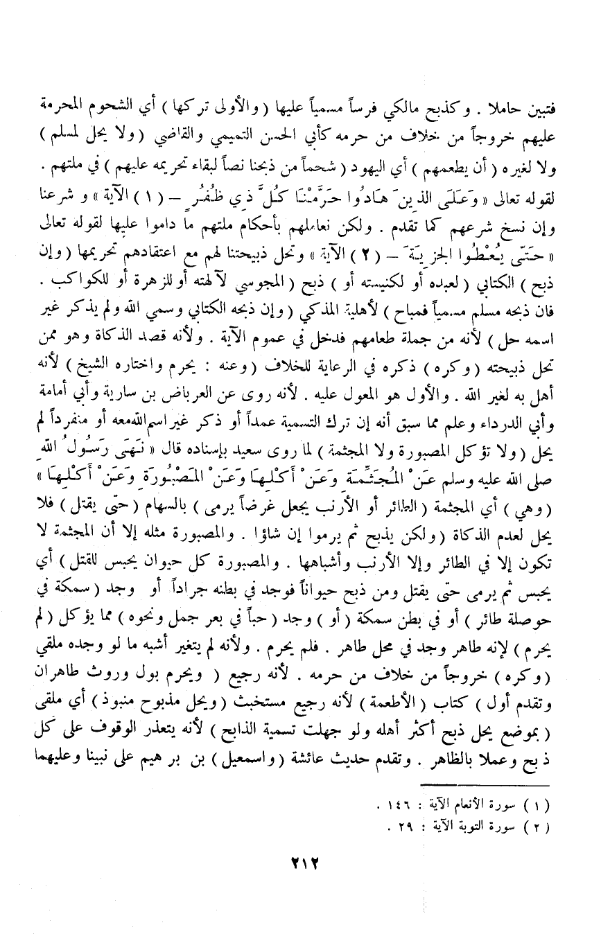 فَتَبَيَّنَ حَامِلًا وَكَذَبْحِ مَالِكِيِّ فَرَسًا مُسَمِّيًا عَلَيْهَا (وَالْأَوْلَى تَرْكُهَا) أَيْ الشُّحُومِ الْمُحَرَّمَةِ عَلَيْهِمْ خُرُوجًا مِنْ خِلَافِ مَنْ حَرَّمَهُ كَأَبِي الْحَسَنِ التَّمِيمِيِّ وَالْقَاضِي (وَلَا يَحِلُّ لِمُسْلِمٍ) وَلَا لِغَيْرِهِ (أَنْ يُطْعِمَهُمْ) أَيْ الْيَهُودَ (شَحْمًا مِنْ ذَبْحِنَا نَصًّا لِبَاءِ تَحْرِيمِهِ عَلَيْهِمْ) فِي مِلَّتِهِمْ لِقَوْلِهِ تَعَالَى {وَعَلَى الَّذِينَ هَادُوا حَرَّمْنَا كُلَّ ذِي ظُفُرٍ} [الأنعام: ١٤٦] الْآيَة وَشَرْعُنَا وَإِنْ نَسَخَ شَرْعَهُمْ كَمَا تَقَدَّمَ وَلَكِنْ نُعَامِلُهُمْ بِأَحْكَامِ مِلَّتِهِمْ مَا دَامُوا عَلَيْهَا لِقَوْلِهِ تَعَالَى {حَتَّى يُعْطُوا الْجِزْيَةَ} [التوبة: ٢٩] الْآيَة وَتَحِلُّ ذَبِيحَتُنَا لَهُمْ مَعَ اعْتِقَادِهِمْ تَحْرِيمَهَا.