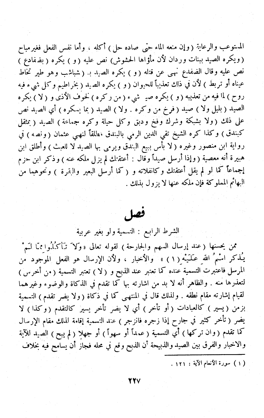 (فَصْلٌ الشَّرْطُ الرَّابِعُ: التَّسْمِيَةُ وَلَوْ بِغَيْرِ عَرَبِيَّةٍ) مِمَّنْ يُحْسِنُهَا (عِنْدَ إرْسَالِ السَّهْمِ وَالْجَارِحَةِ) لِقَوْلِهِ تَعَالَى {وَلا تَأْكُلُوا مِمَّا لَمْ يُذْكَرِ اسْمُ اللَّهِ عَلَيْهِ} [الأنعام: ١٢١] وَالْأَخْبَارُ، وَلِأَنَّ الْإِرْسَالَ هُوَ الْفِعْلُ الْمَوْجُودُ مِنْ الْمُرْسِلِ فَاعْتُبِرَتْ التَّسْمِيَةُ عِنْدَهُ كَمَا تُعْتَبَرُ عِنْدَ الذَّبْحِ.